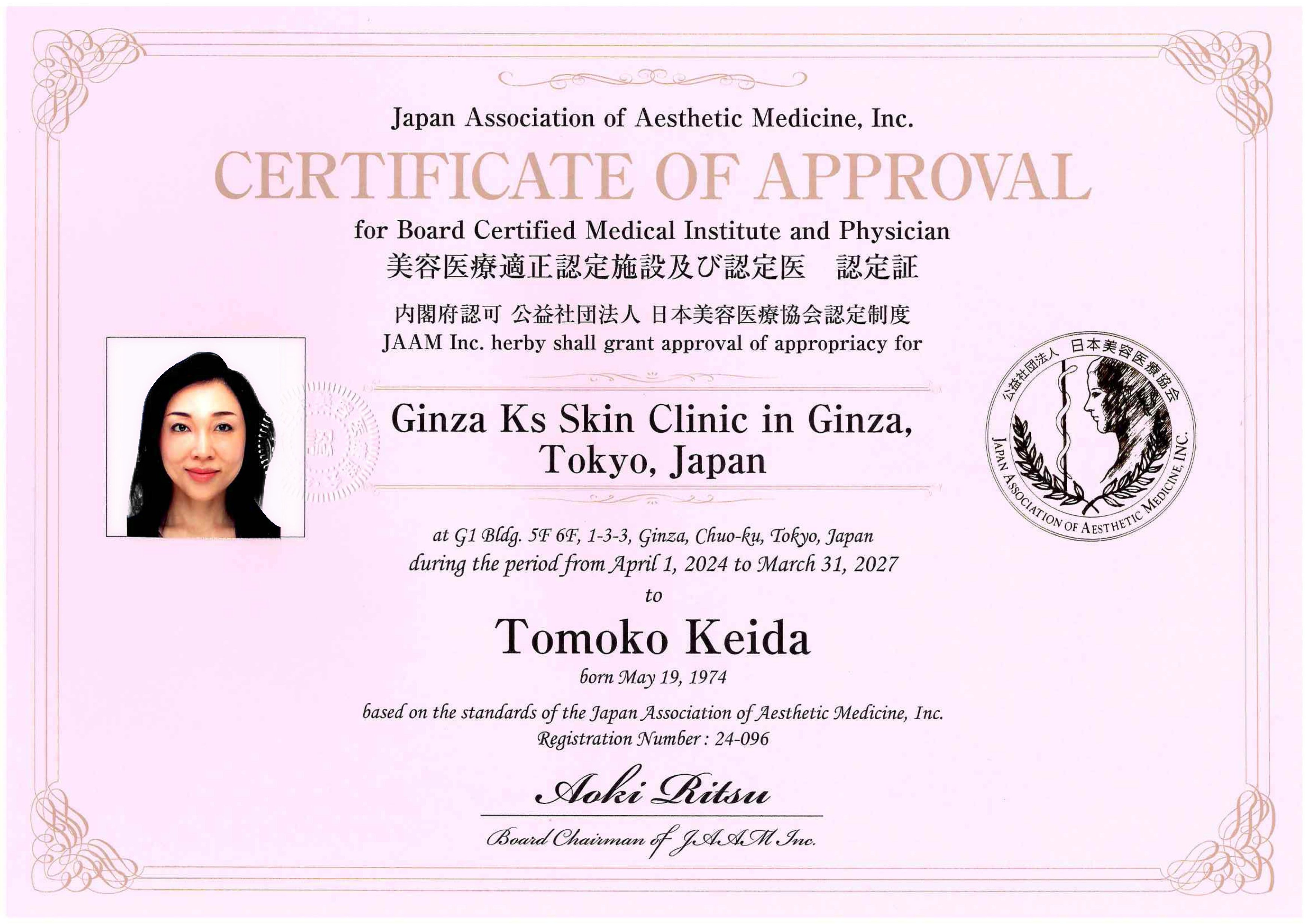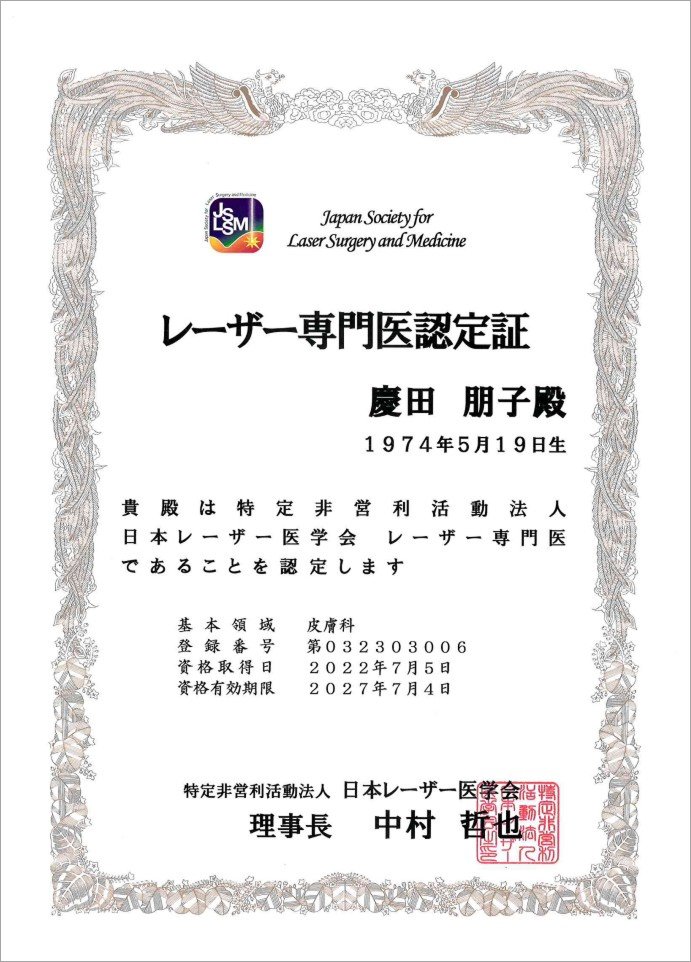 院長の慶田朋子は、内閣府認定の公益社団法人日本美容医療協会(JAAM)から、協会の定める認定基準を満たしている医師に審査の上交付される「適正認定医(マル適)」の資格を取得しています。