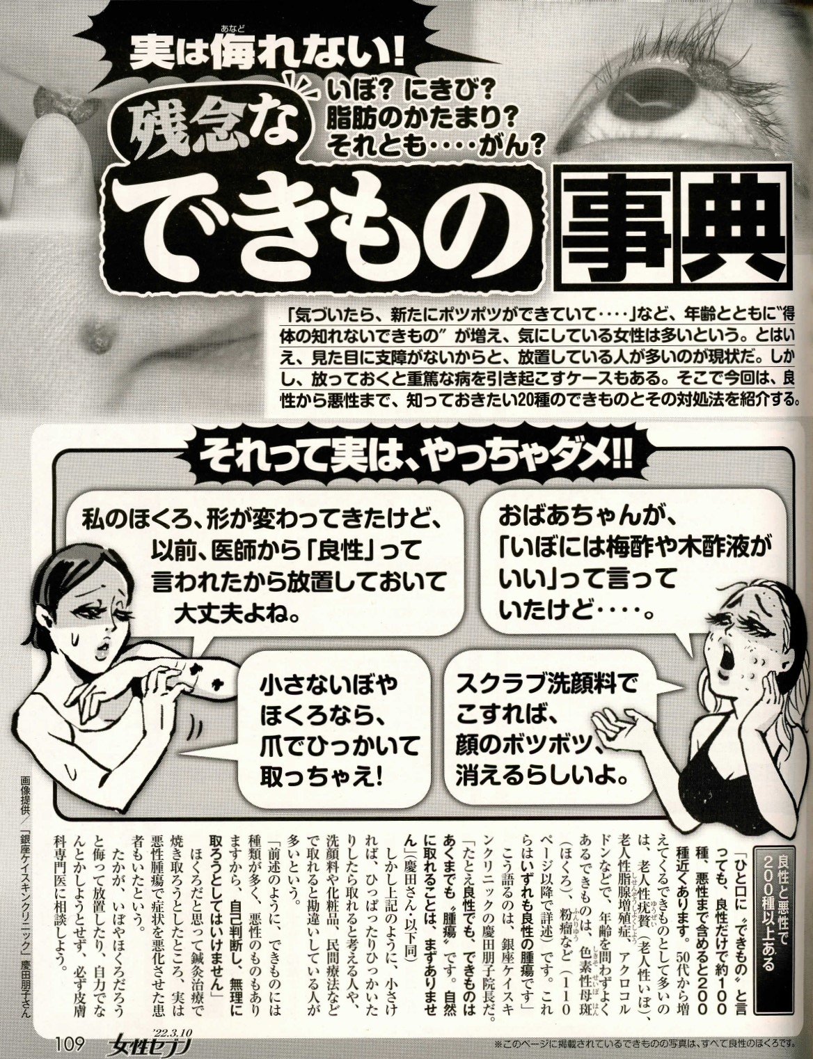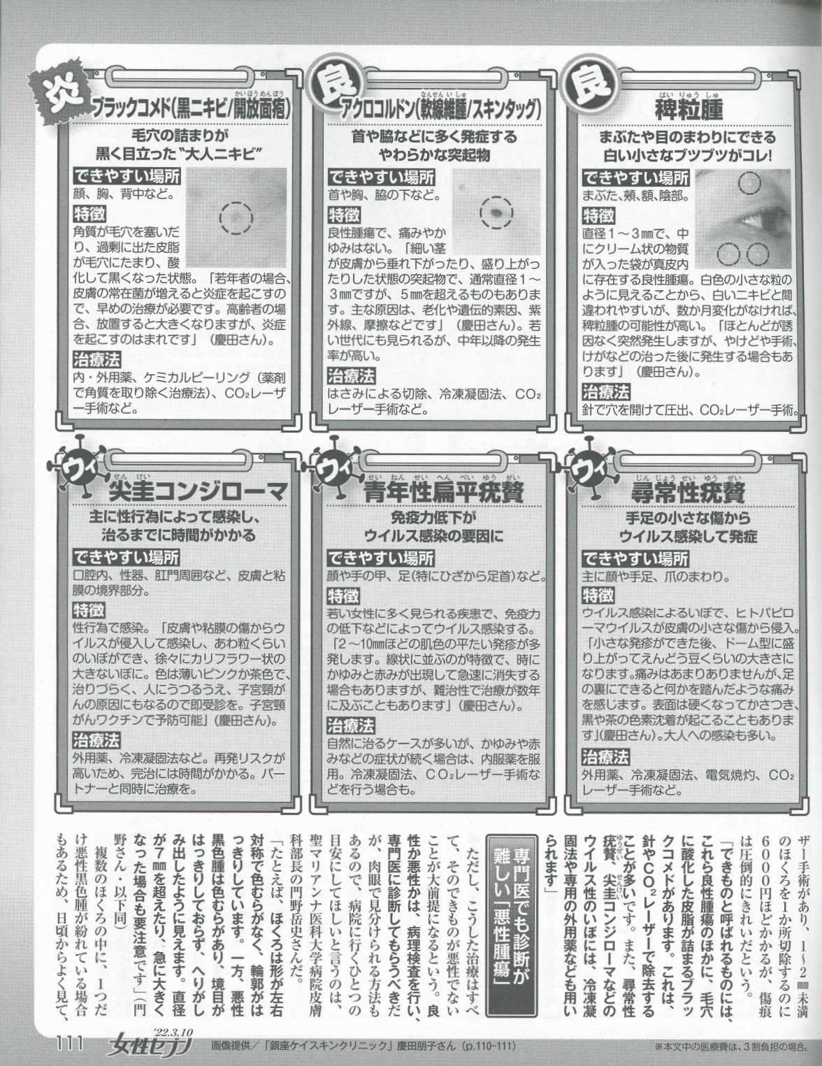 特集〝実は侮れない!残念なできもの事典″(P109~113に掲載)に慶田院長の監修記事が掲載されました。