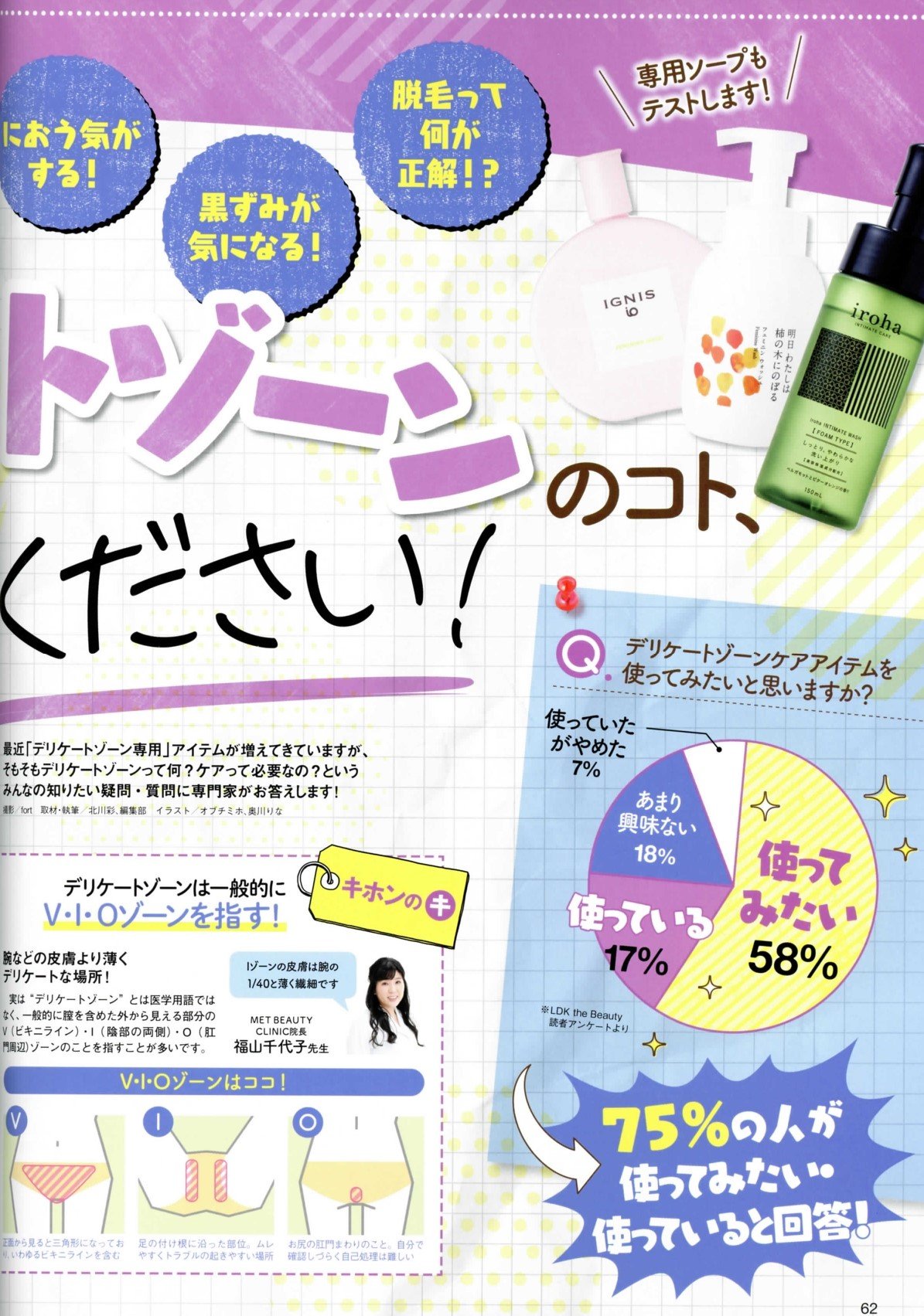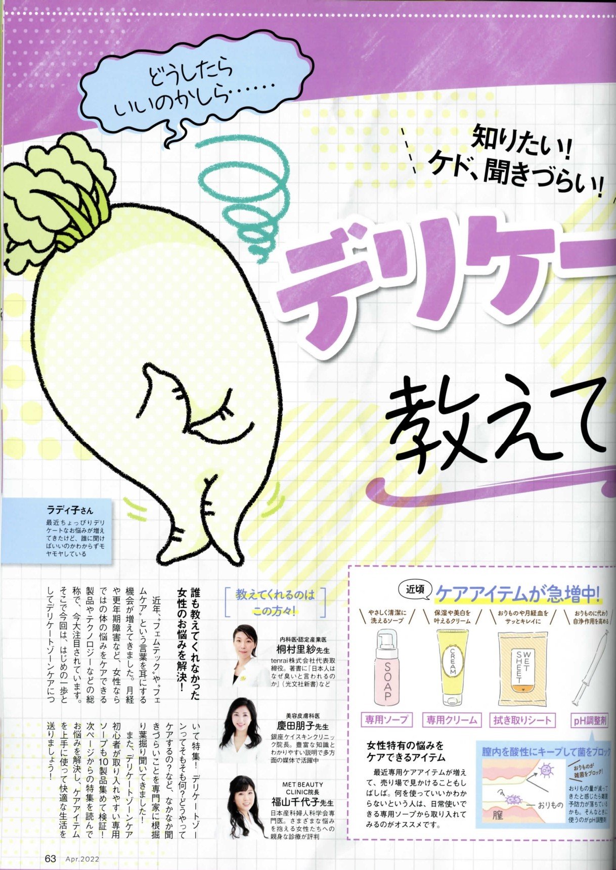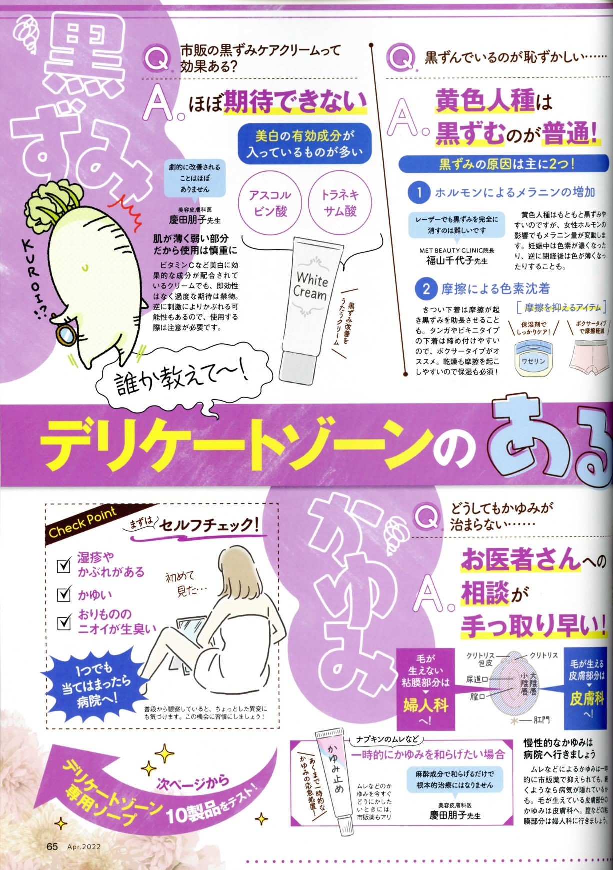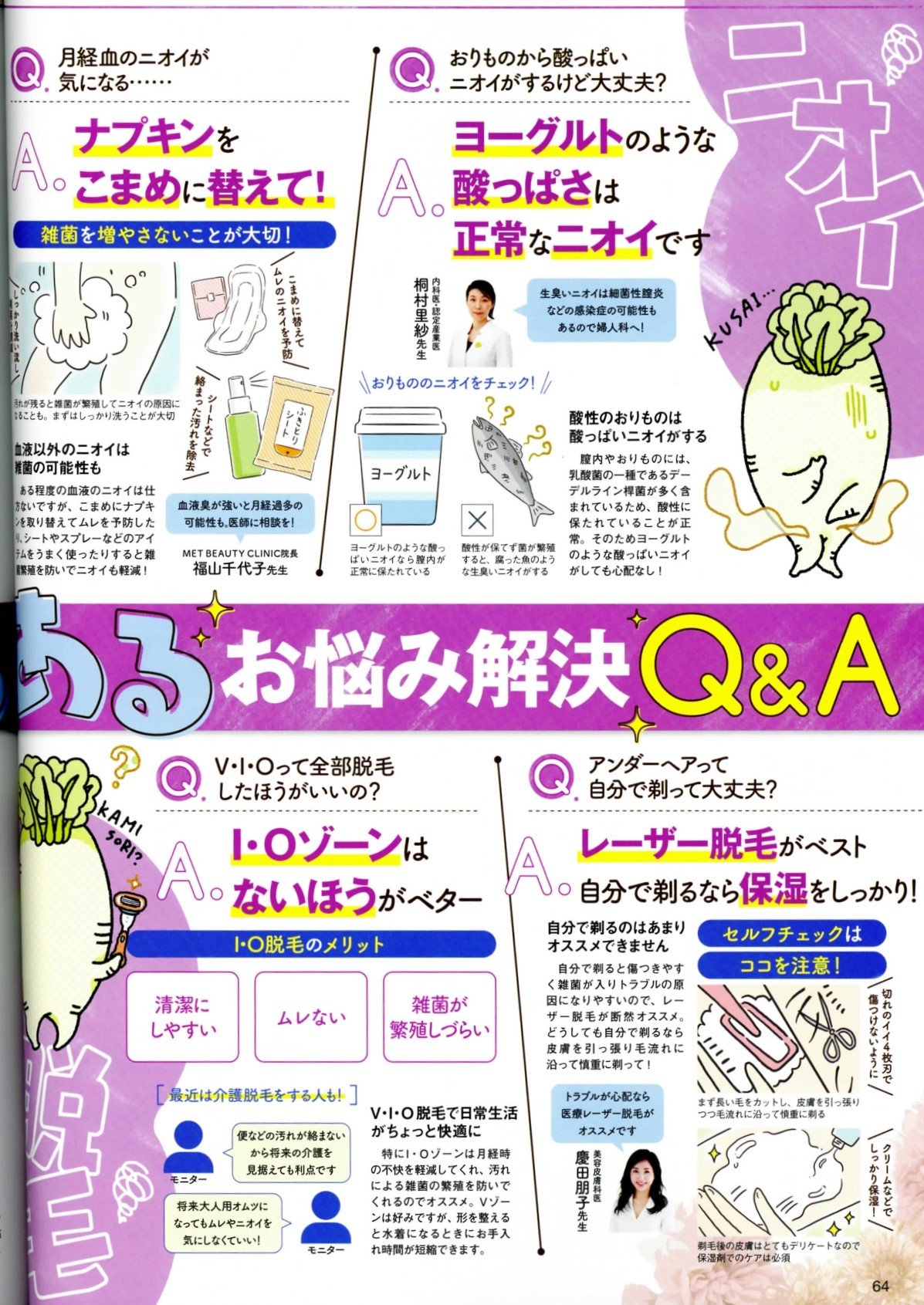 特集「におう気がする!黒ずみが気になる!脱毛って何が正解!?知りたい!ケド、聞き辛い!デリケートゾーンのコト、教えてください!」(P62~65)に慶田院長の監修記事が掲載されました。