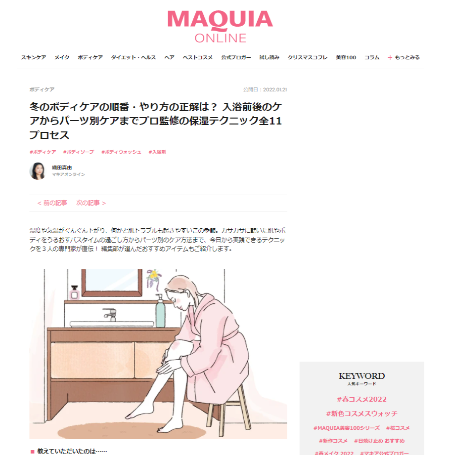 特集「冬のボディケアの順番・やり方の正解は? 入浴前後のケアからパーツ別ケアまでプロ監修の保湿テクニック全11プロセス」に慶田院長の監修・特集記事が掲載されました。