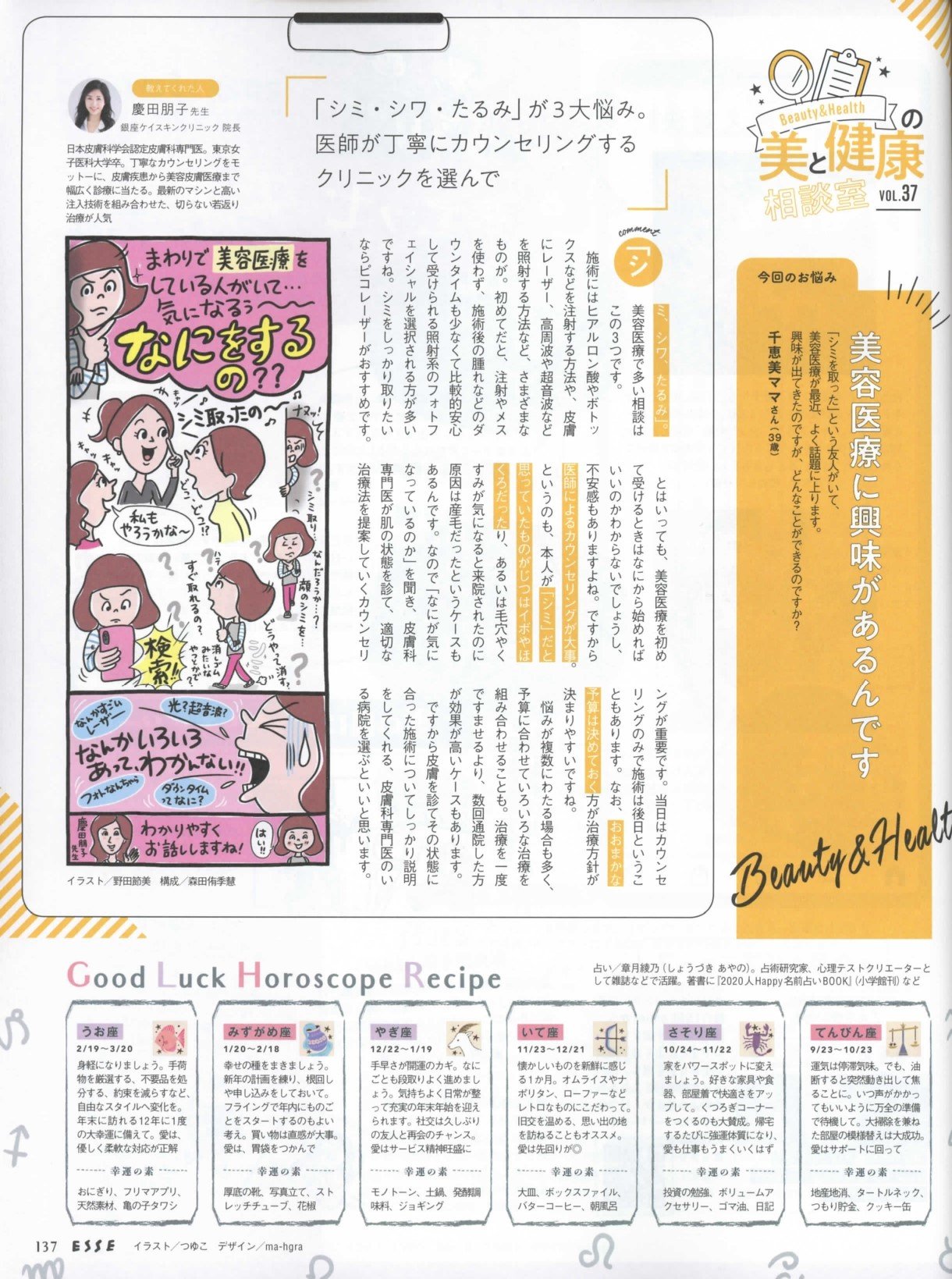 特集〝美と健康の相談室VOL.37「シミ・シワ・たるみ」が3大悩み。医師が丁寧にカウンセリングするクリニックを選んで″(P137)に慶田院長の記事が掲載されました。