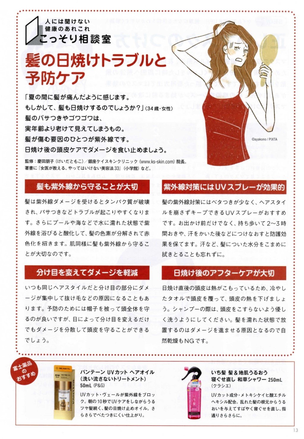 富士薬品発行のオリジナルフリーペーパーの特集『人には聞けない健康のあれこれこっそり相談室 髪の日焼けトラブルと予防ケア』(P13)に慶田院長監修記事が掲載されました。