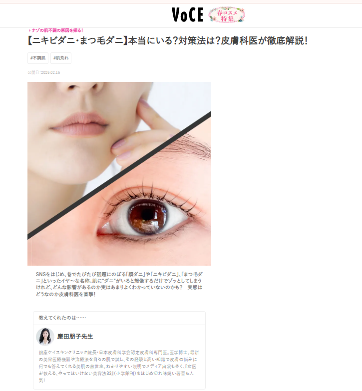 02.162025 メディア掲載 WEB WEB『VOCE WEB』 WEB『VOCE WEB』WEB『VOCE WEB』(2025年2月16日公開)特集「【ニキビダニ・まつ毛ダニ】本当にいる?対策法は?皮膚科医が徹底解説!」に慶田の取材・監修記事が掲載されました。