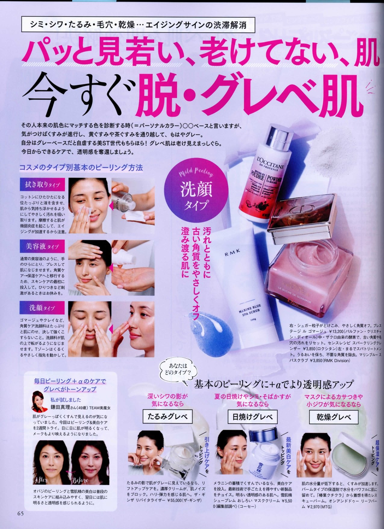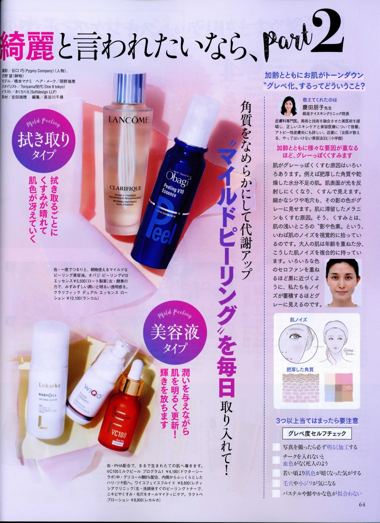今月号では、3つの特集に慶田院長の監修・取材記事が掲載されています。1つ目の特集は‟アンチ→ナイスエイジング「私、老けた?」につけるクスリ" パッと見若い、老けてない、肌綺麗と言われたいなら、今すぐ脱グレべ肌です。