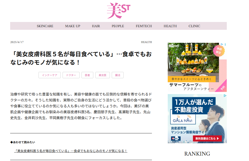 06.172025 メディア掲載 WEB WEB『美ST ONLINE』 WEB『美ST ONLINE』WEB『美ST ONLINE』(2025年6月17日公開)特集「美女皮膚科医5名が毎日食べている」...食卓でもおなじみのモノが気になる!に慶田のコメントが掲載されました。