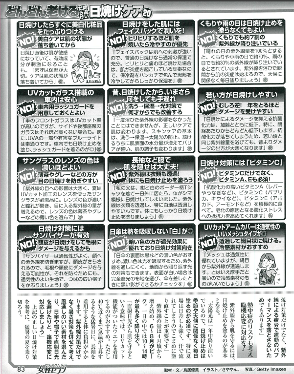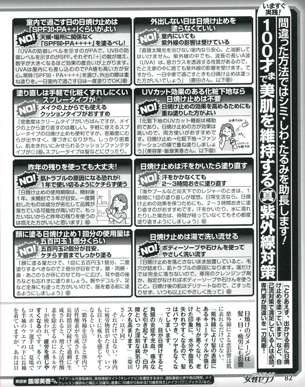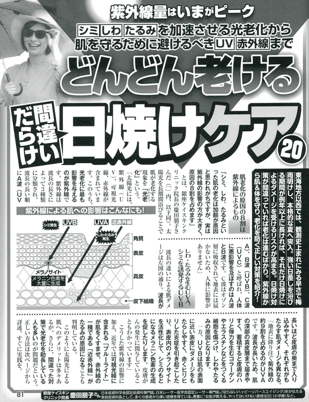 特集「紫外線量は今がピーク シミ・しわ・たるみを加速させる光老化から肌を守るために避けるべきUV・赤外線までどんどん老ける間違いだらけ日焼けケア」に慶田の取材・監修記事が掲載されました。