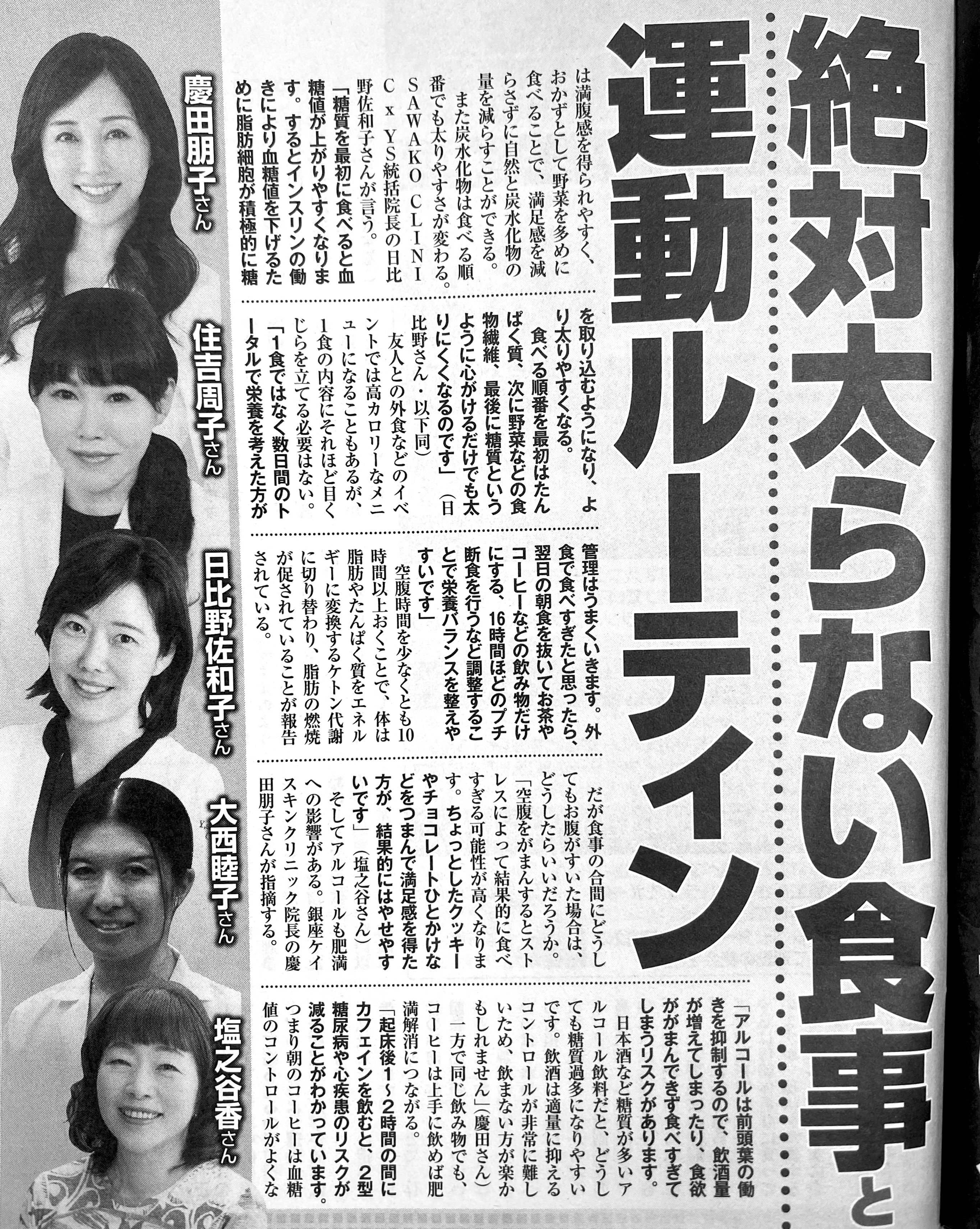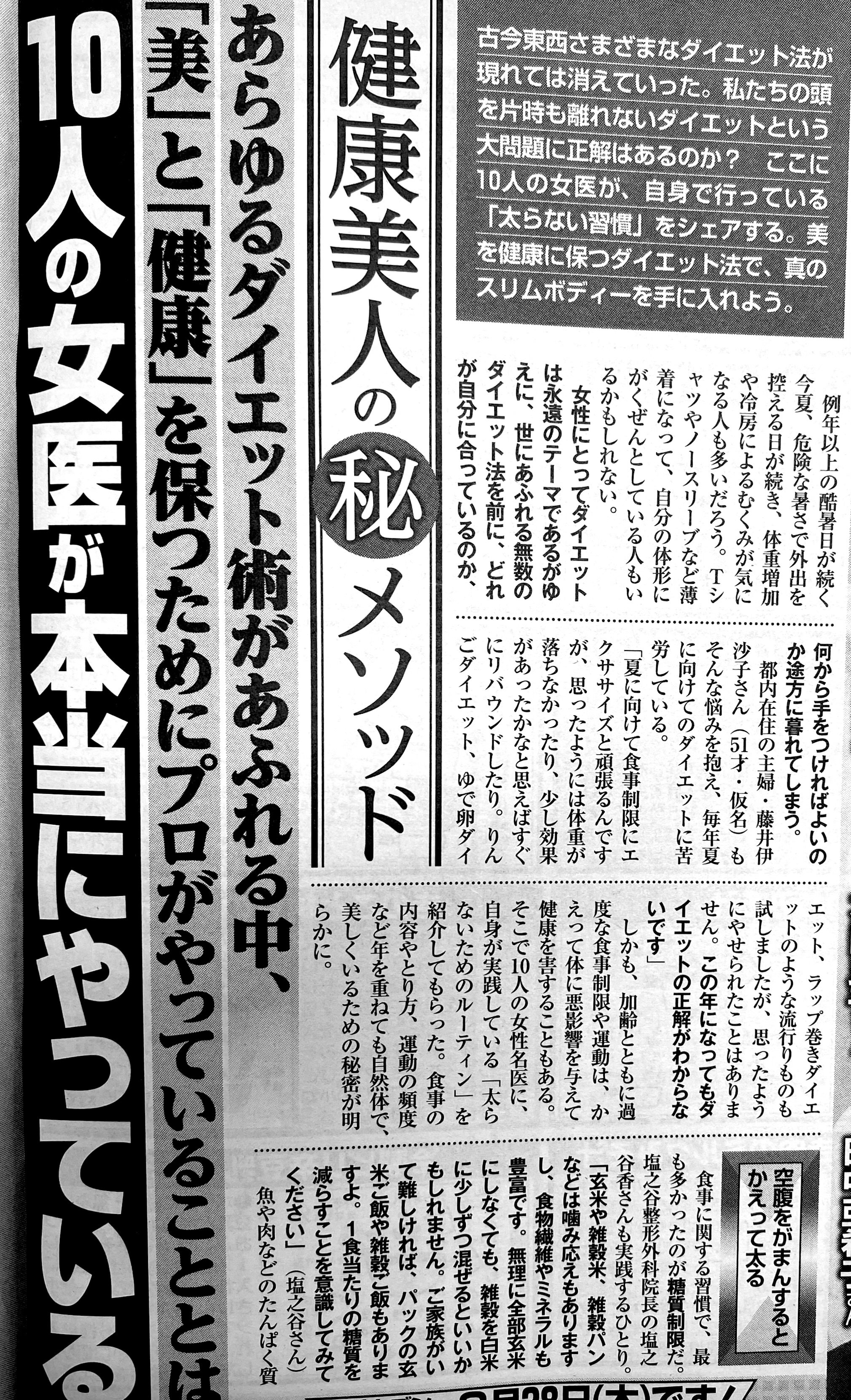 08.182025 メディア掲載 雑誌 雑誌『女性セブン』2025年9月4日号 雑誌『女性セブン』2025年9月4日号雑誌『女性セブン』2025年9月4日号(2025年8月18日発売)特集「10人の女医が本当にやっている絶対太らない食事と運動ルーティン」に慶田の取材・監修記事が掲載されました。
