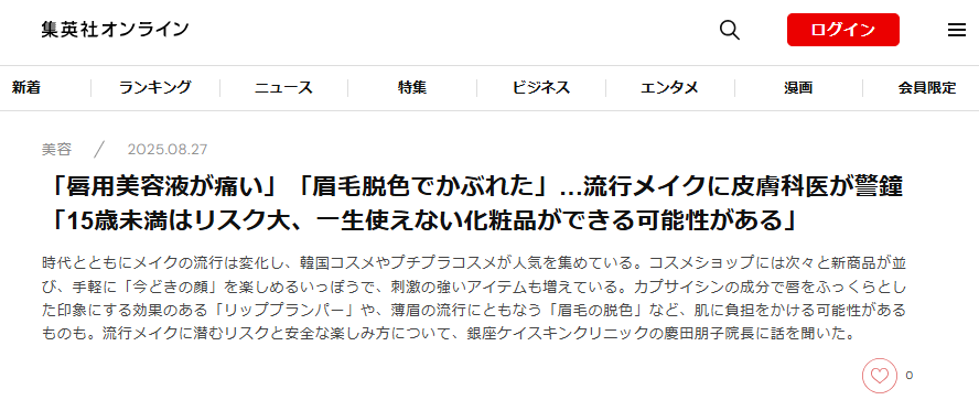 特集「唇用美容液が痛い」「眉毛脱色でかぶれた」...流行メイクに皮膚科医が警鐘「15歳未満はリスク大、一生使えない化粧品ができる可能性がある」に慶田の取材・監修記事が掲載されました。