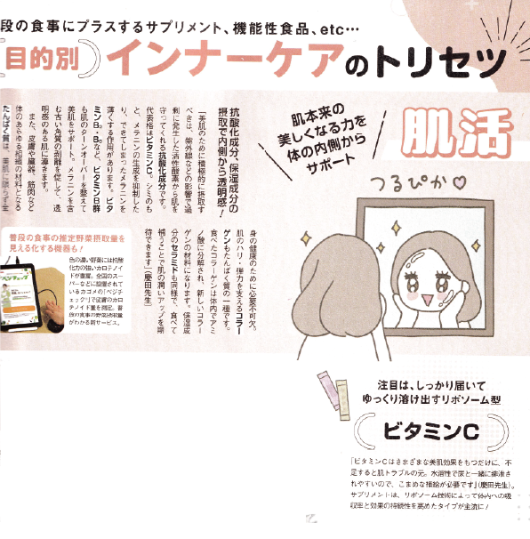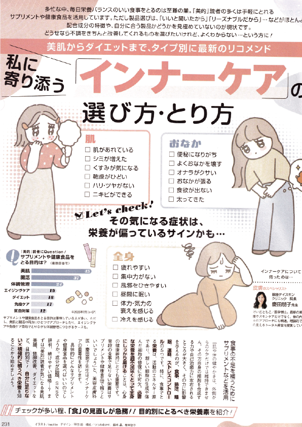 09.222025 メディア掲載 雑誌 雑誌『美的』2025年11月号 雑誌『美的』2025年11月号(2025年9月22日発売)特集「美肌からダイエットまで、タイプ別に最新のリコメンド 私に寄り添う「インナーケアの選び方・とり方」」に慶田の取材・監修記事が掲載されました。