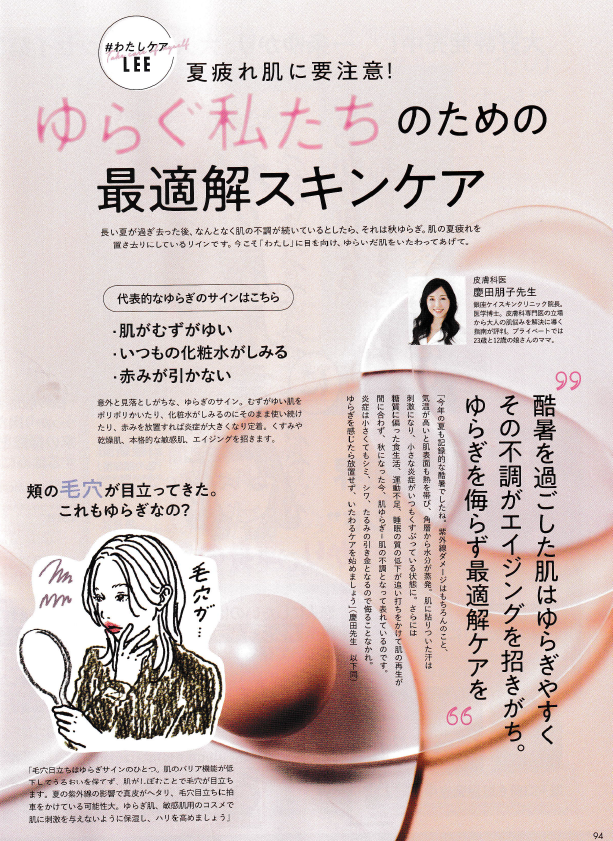 10.072025 メディア掲載 雑誌 雑誌『LEE』2025年11月号 雑誌『LEE』2025年11月号(2025年10月7日発売)特集「ゆらぐ私たちのための最適解スキンケア」に慶田の取材・監修記事が掲載されました。