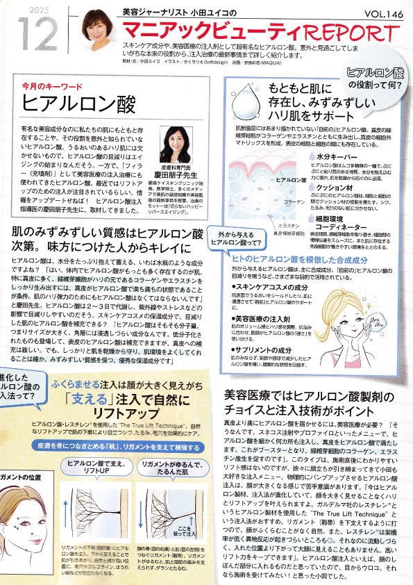 10.222025 メディア掲載 雑誌 雑誌『MAQUIA』2025年12月号 雑誌『MAQUIA』2025年12月号(2025年10月22日発売)特集「美容ジャーナリスト小田ユイコのマニアックビューティREPORT Vol.146」に慶田の取材・監修記事が掲載されました。