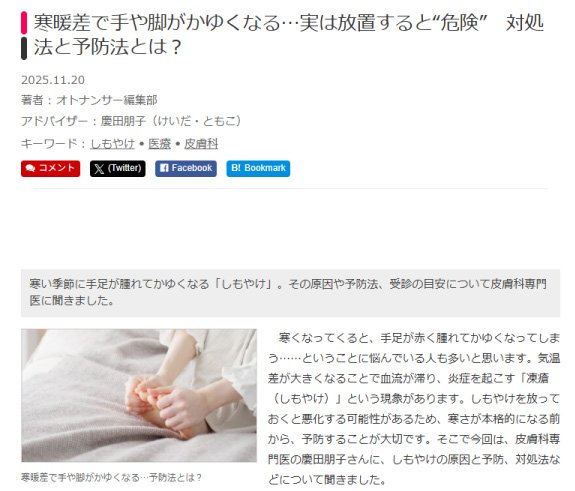 特集②「【寒暖差で手や脚がかゆくなる…実は放置すると“危険” 対処法と予防法とは?」(2025年11月20日公開)