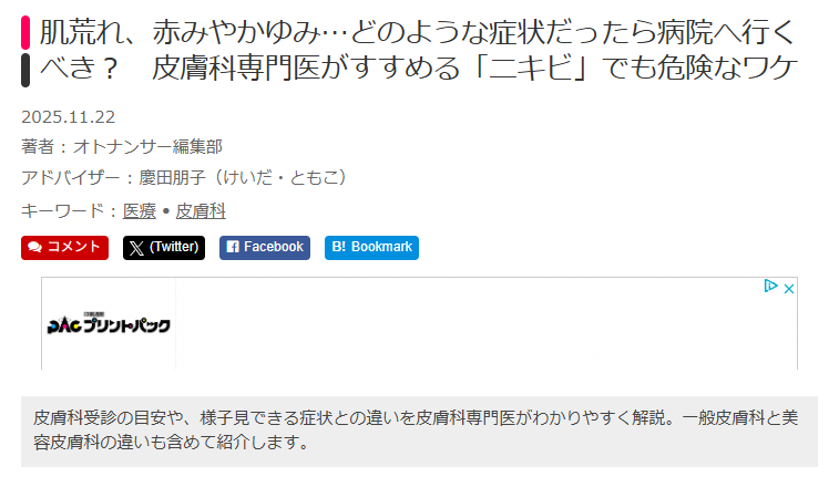 特集③「肌荒れ、赤みやかゆみ…どのような症状だったら病院へ行くべき? 皮膚科専門医がすすめる「ニキビ」でも危険なワケ」(2025年11月23日公開)