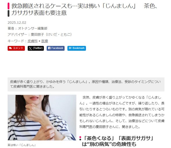 特集④「救急搬送されるケースも…実は怖い「じんましん」 茶色、ガサガサ表面も要注意」(2025年12月2日公開)