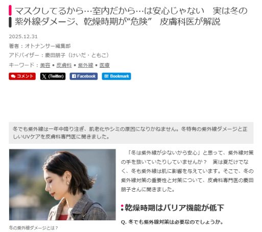 特集①「マスクしてるから…室内だから…は安心じゃない 実は冬の紫外線ダメージ、乾燥時期が“危険” 皮膚科医が解説」(2025年12月31日公開)