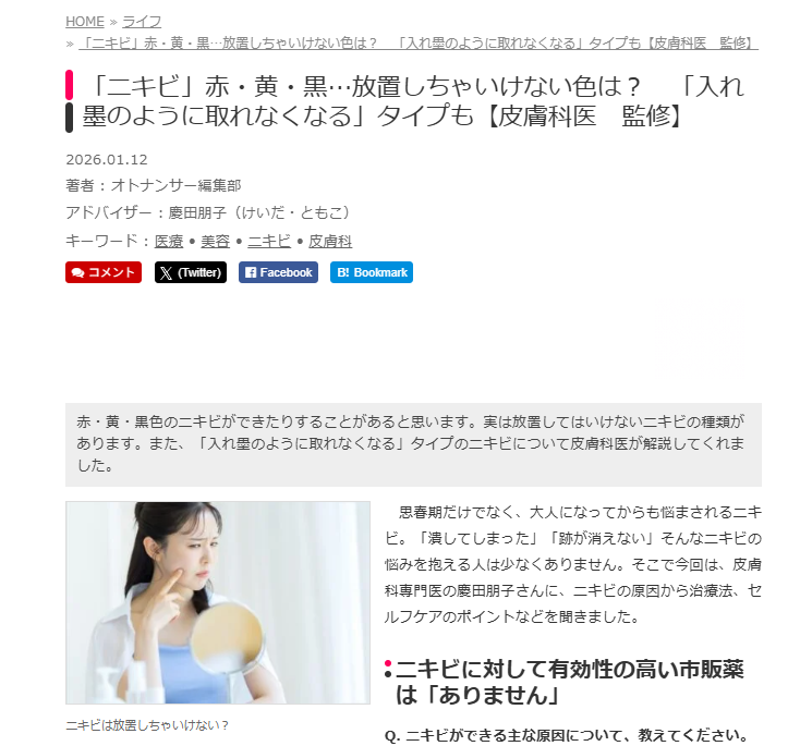 特集③「「ニキビ」赤・黄・黒…放置しちゃいけない色は? 「入れ墨のように取れなくなる」タイプも【皮膚科医 監修】」(2026年1月12日公開)