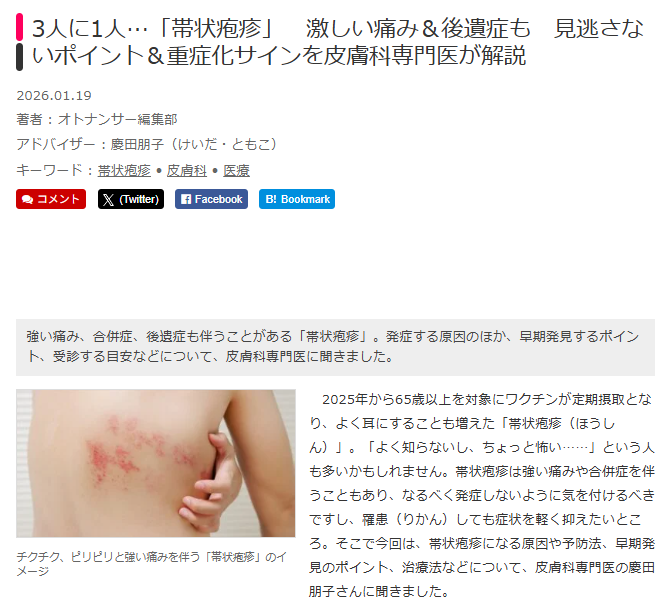 特集⑤「3人に1人…「帯状疱疹」 激しい痛み&後遺症も 見逃さないポイント&重症化サインを皮膚科専門医が解説」(2026年1月19日公開)