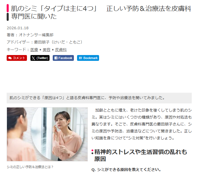 特集④「肌のシミ「タイプは主に4つ」 正しい予防&治療法を皮膚科専門医に聞いた」(2026年1月18日公開)