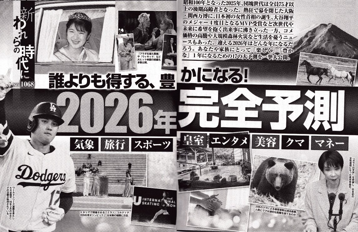 12.222025 メディア掲載 雑誌 雑誌『女性セブン』2025年1月8・15日号 雑誌『女性セブン』2025年1月8・15日号(2025年12月22日発売)特集「誰よりも得する、豊かになる!2026年完全予測」に慶田の取材・監修記事が掲載されました。