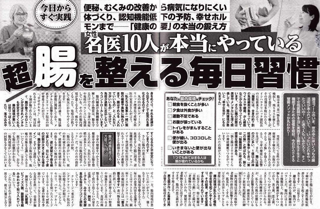 02.052026 メディア掲載 雑誌 雑誌『女性セブン』2025年2月19・26日号 雑誌『女性セブン』2025年2月19・26日号(2026年2月5日発売)特集「女性名医10人が本当にやっている超腸を整える毎日習慣」に慶田のコメントが掲載されました。