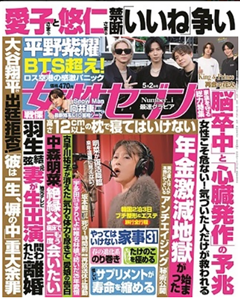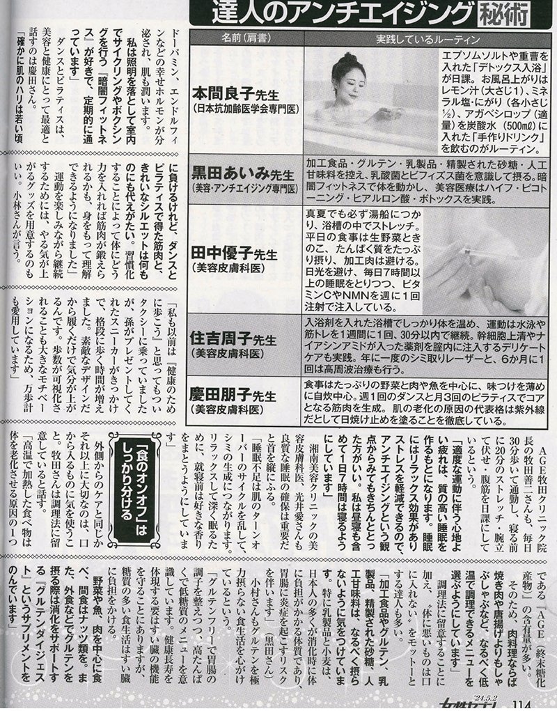 05.022024 メディア掲載 雑誌 雑誌『女性セブン』5/2日号 雑誌『女性セブン』5/2日号雑誌『女性セブン』5/2日号(2024年5月2日発売)特集「美の達人10人が本当にやっているアンチエイジング秘術公開」に慶田の取材記事が掲載されました。