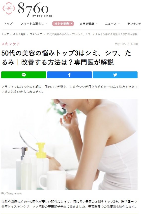特集「50代美容の悩みトップ3は、シミ、シワ、たるみ 改善する方法は?専門医が解説」に慶田院長の監修・取材記事が掲載されました。