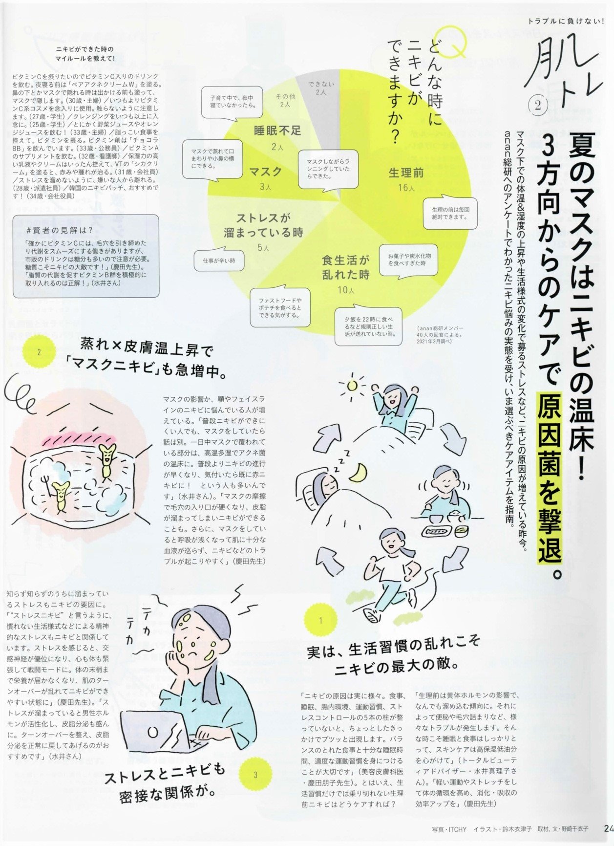 マスクの下での体温&湿度の上昇や、生活様式の変化で募るストレスなど、最近はニキビの原因が増えています。anan本誌のアンケートでわかったニキビの悩みの実態を受け、原因と対処法を伝授させていただきます。