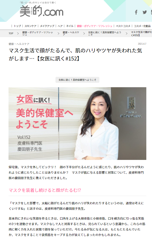 特集「女医に訊く♯152 マスク生活で顔がたるんで、肌のハリやツヤが失われた気がします...」に慶田院長の監修・取材記事が掲載されました。