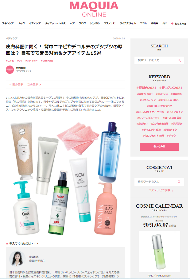 特集「皮膚科医に聞く! 背中ニキビやデコルテのブツブツの原因は? 自宅でできる対策&ケアアイテム15選」に慶田院長の監修・取材記事が掲載されました。