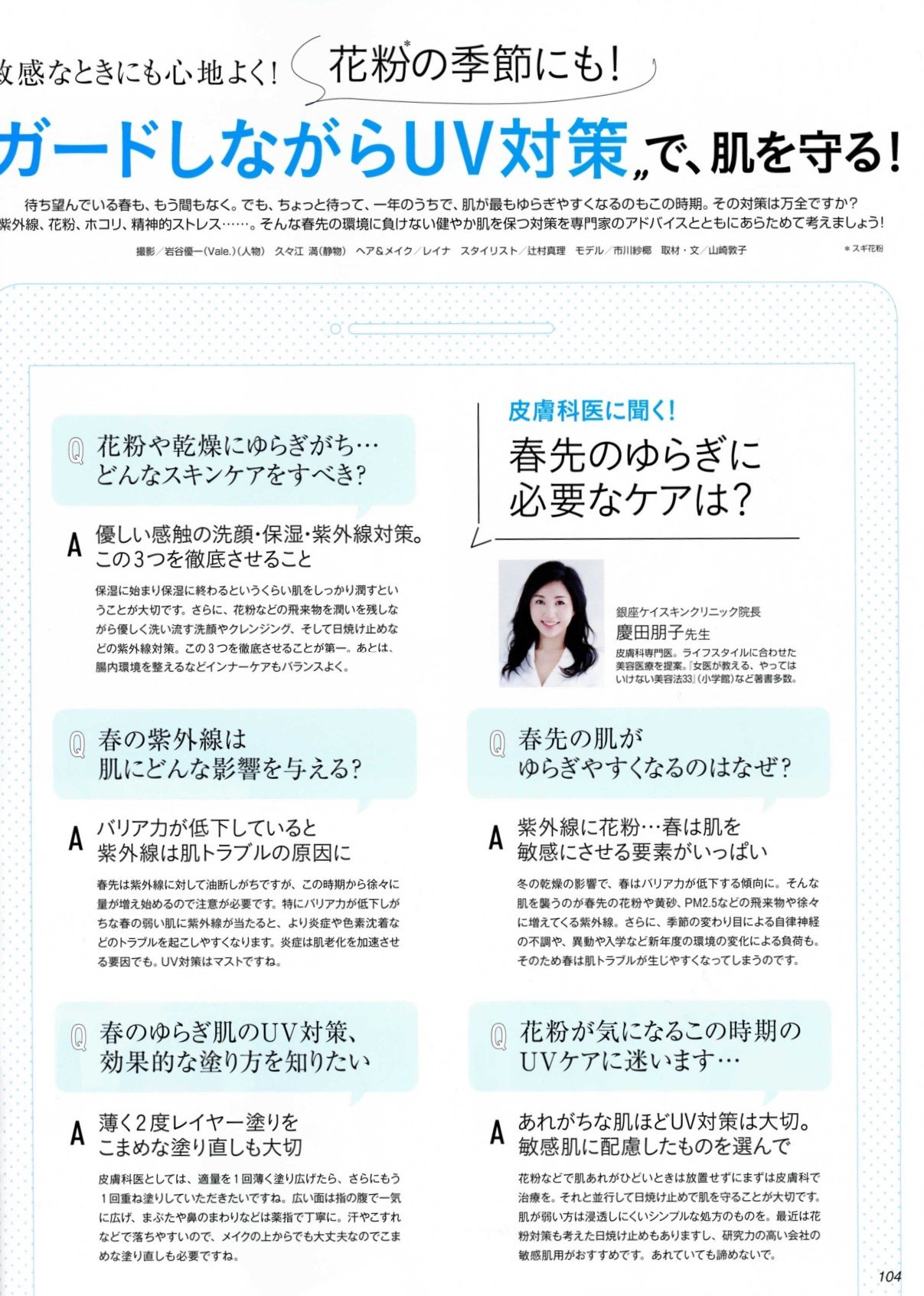 特集「敏感なときにも心地よく!花粉の季節にも!ガードしながらUV対策で、肌を守る!」(掲載P104~P105)に慶田院長の監修・取材記事が掲載されています。