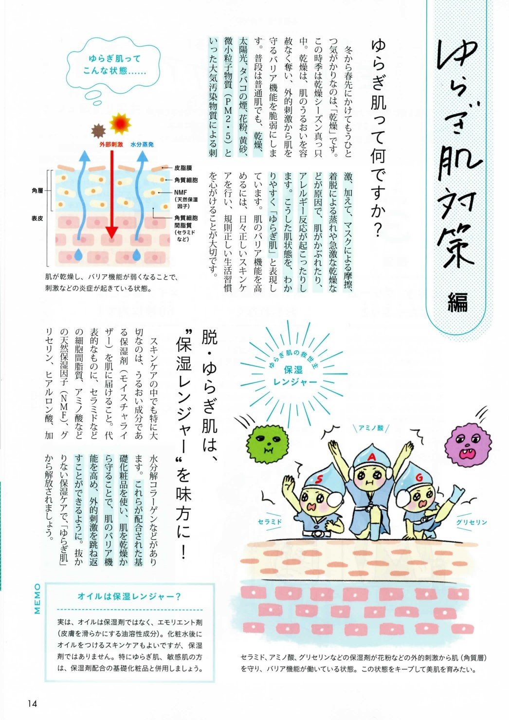 に届けること。代表的なものに、セラミドなどの細胞間脂質、アミノ酸などの天然保湿因子(NMF)、グリセリン、ヒアルロン酸、加水分解コラーゲンなどがあります。これらが配合された基礎化粧品を使い、肌を乾燥から守ることで、肌のバリア機能を高め、外的刺激を跳ね返すことができるように、抜かりない保湿ケアで、「ゆらぎ肌」から解放されましょう。