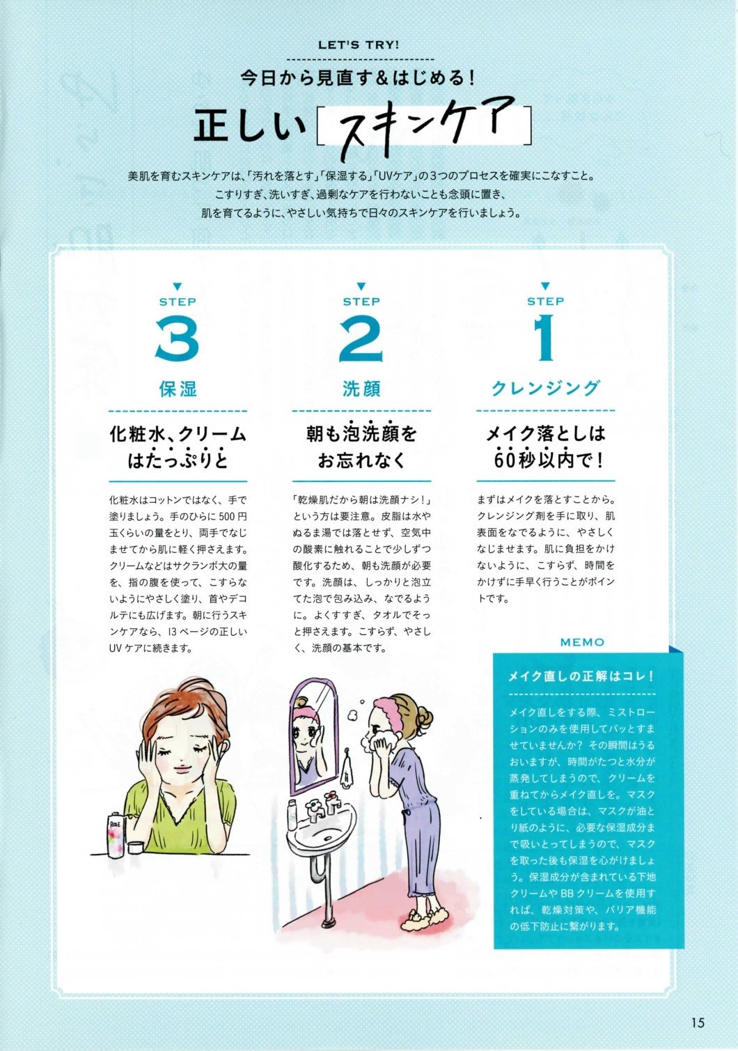 美肌を育むスキンケアは、「汚れを落とす」「保湿する」「UVケア」の3つのプロセスを確実にこなすこと。こすりすぎ、洗いすぎ、過剰なケアを行わないことも念頭に置き、肌を育てるように、やさしい気持ちで日々のスキンケアを行いましょう。