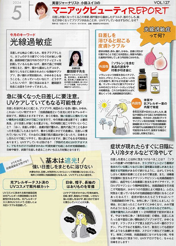 03.222024 メディア掲載 雑誌 雑誌『MAQUIA』2024年5月号 雑誌『MAQUIA』2024年5月号雑誌『MAQUIA』2024年5月号(2024年3月22日発売)特集「美容ジャーナリスト小田ユイコのマニアックビューティーREPORT 」に慶田の取材・監修記事が掲載されました。