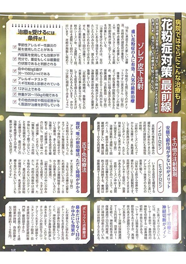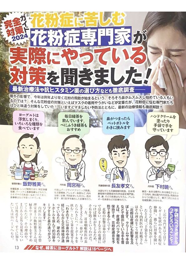 02.082024 メディア掲載 雑誌 雑誌『女性セブン』2024年2/22号 雑誌『女性セブン』2024年2/22号雑誌『女性セブン』2024年2/22号(2024年2月8日発売)特集「花粉症対策最前線」に当院の『花粉症ボトックス注射』をご紹介いただきました。