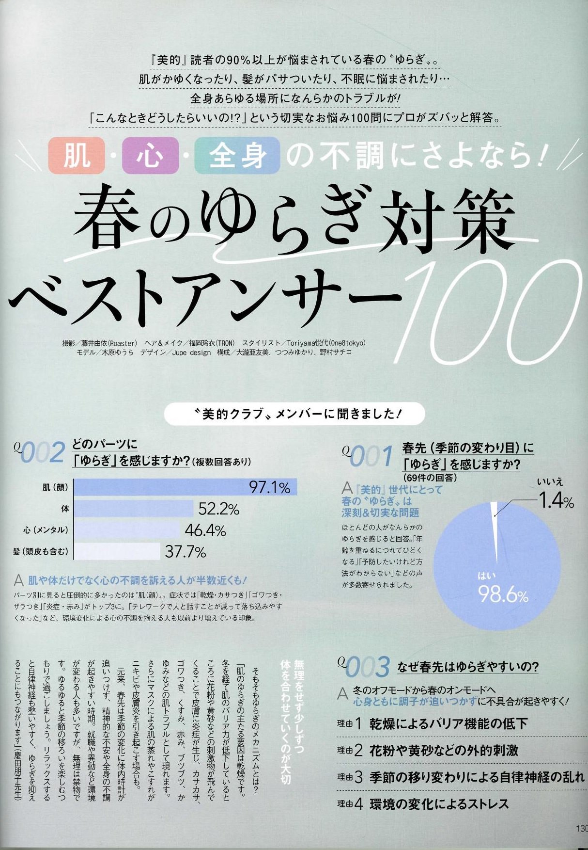 03.242023 メディア掲載 雑誌 雑誌『美的』2023年3月号(2023年1月20日発売) 雑誌『美的』2023年3月号(2023年1月20日発売)特集 肌・心・全身の不調にさよなら!春のゆらぎ対策ベストアンサーに慶田の監修・取材記事が掲載されました。