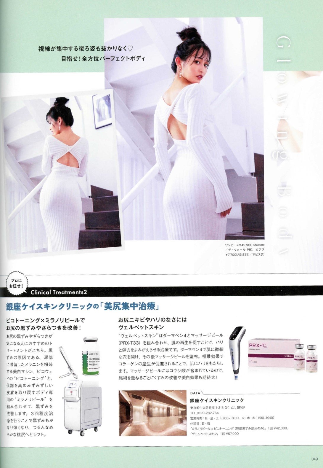 特集「Glowing Body なめらかな艶ボディに格上げ!パーフェクトボディをサポートする、注目のボディケア&トリートメント」(P49掲載)に当院でのおすすめ治療が掲載され