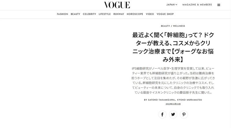BEAUTY特集「最近よく聞く「幹細胞」って? ドクターが教える、コスメからクリニック治療まで【ヴォーグなお悩み外来】」に慶田院長の監修・取材記事が掲載されています。