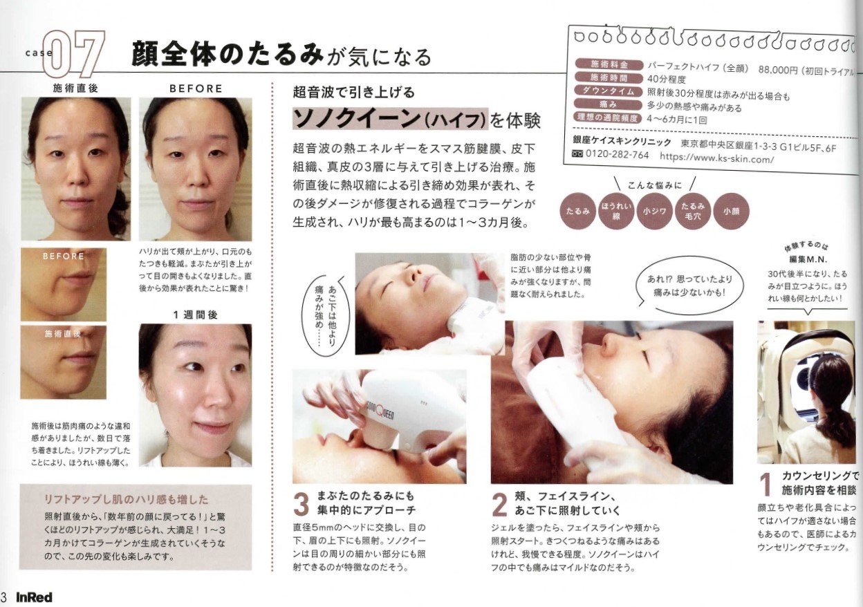毛穴、シミ、たるみと、肌悩みが増える30代。お手入れに新風を吹かせたい時に気になってくるのが美容医療です。今回、InRed編集部員の方に当院で人気の治療『水光注射(水光プラス)』と『ソノクイーン』を体験して頂きました。施術の様子や直後のレポートが掲載されています。