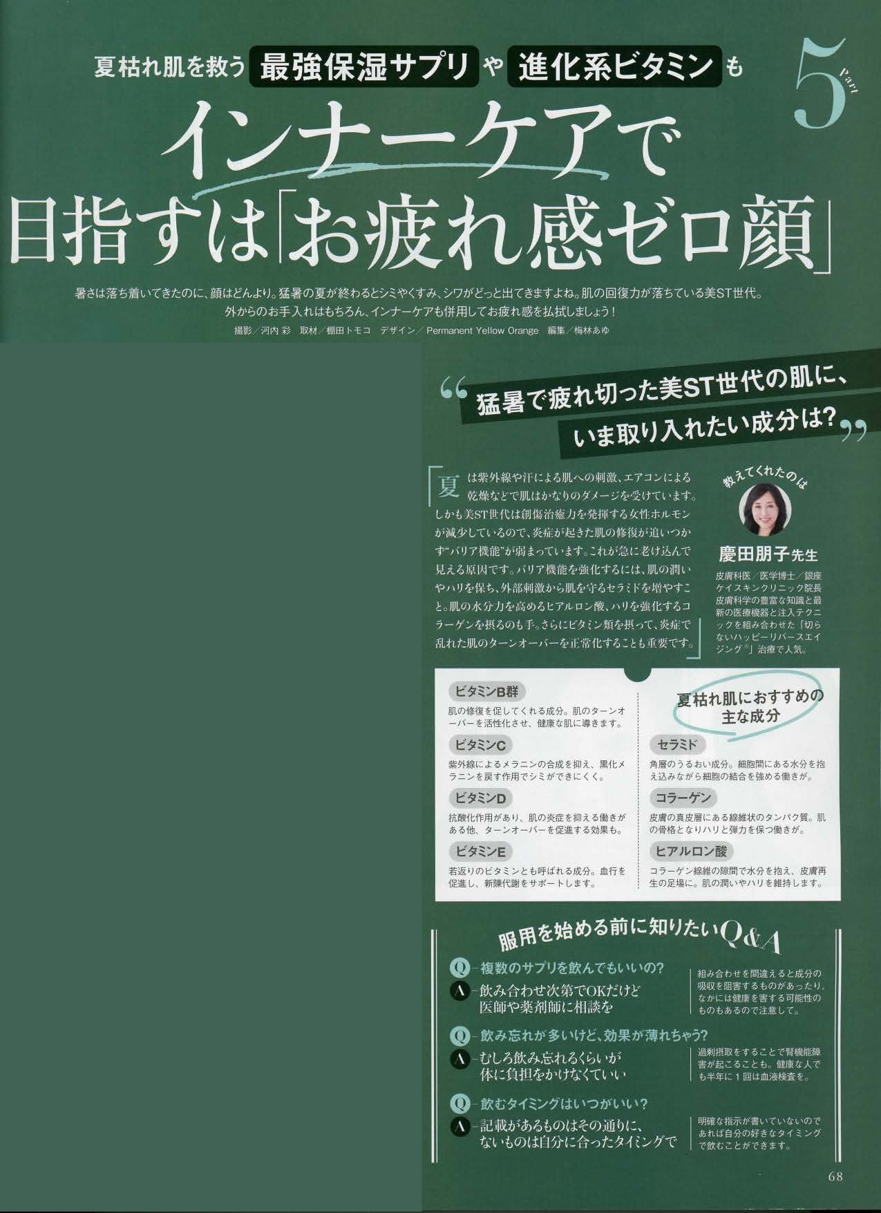 09.172024 メディア掲載 雑誌 雑誌『美ST』2024年11月号 雑誌『美ST』2024年11月号雑誌『美ST』2024年11月号(2024年9月17日発売)特集 インナーケアで目指すは「お疲れ感ゼロ顔」 に慶田の取材・監修記事が掲載されました。