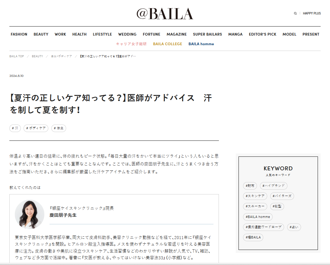 08.102024 メディア掲載 WEB WEB『@BAILA』 WEB『@BAILA』WEB『WEB『@BAILA』(2024年8月10日公開)特集 【夏汗の正しいケア知ってる?】医師がアドバイス 汗を制して夏を制す! に慶田の取材・監修記事が掲載されました。