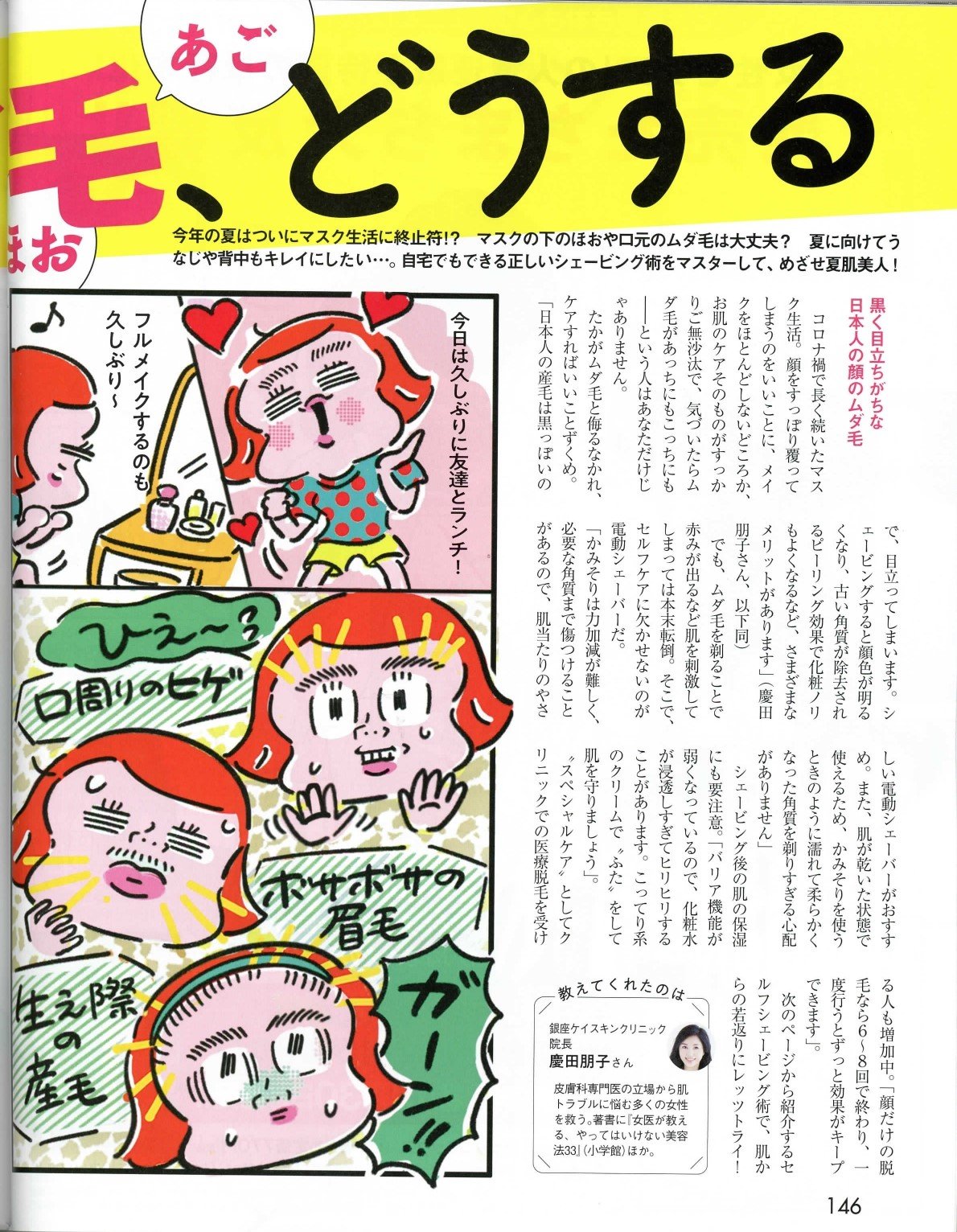 「かみそりは力加減が難しく、必要な角層まで傷つけることもあるので、肌当たりのやさしい電動シェーバーがおすすめです。また、肌が乾いた状態で使えるため、かみそりを使うときのように濡れて柔らかくなった角層を剃りすぎる心配がありません」。シェービング後の肌の保湿にも要注意です。「バリア機能が弱くなっているので、化粧水が浸透しすぎてヒリヒリすることがあります。こってり系のクリームで"ふた"をして肌を守りましょう。」〝スペシャルケア〟としてクリニックでの医療脱毛を受ける人も増加中です。「顔だけの脱毛なら6~8回で終わり、一度行うとずっと効果がキープできます」。