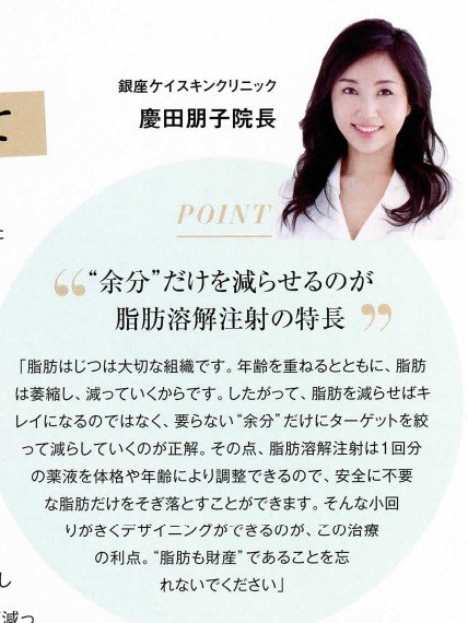 脂肪はじつは大切な組織です。年齢を重ねるとともに、脂肪は委縮し、減っていくからです。したがって、脂肪を減らせばキレイになるのではなく、要らない"余分"だけにターゲットを絞って減らしていくのが正解です。その点、『脂肪溶解注射』は1回分の薬液を体格や年齢により調整できるので、安全に不要な脂肪だけを削ぎ落すことが出来ます。そんな小回りがきくデザイニングができるのが、この治療の利点です。"脂肪も財産"であることを忘れないでください。