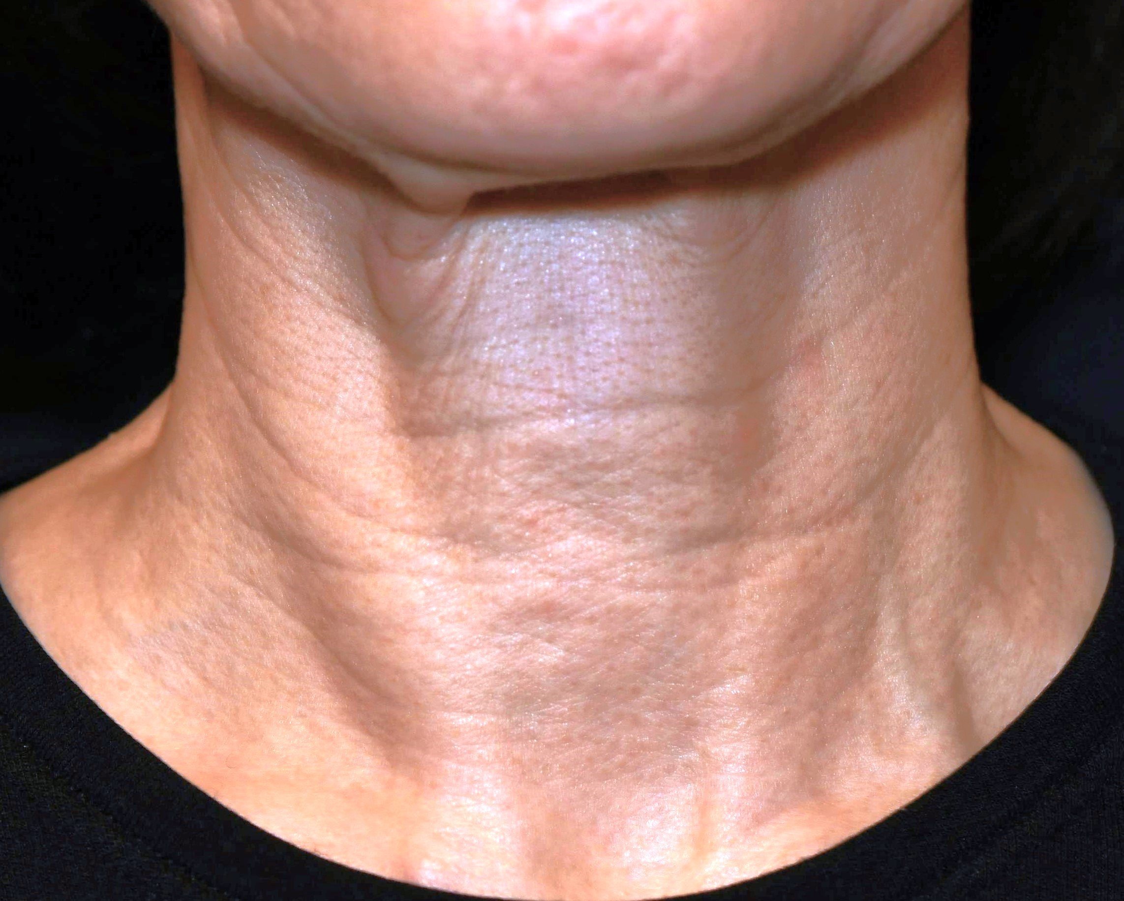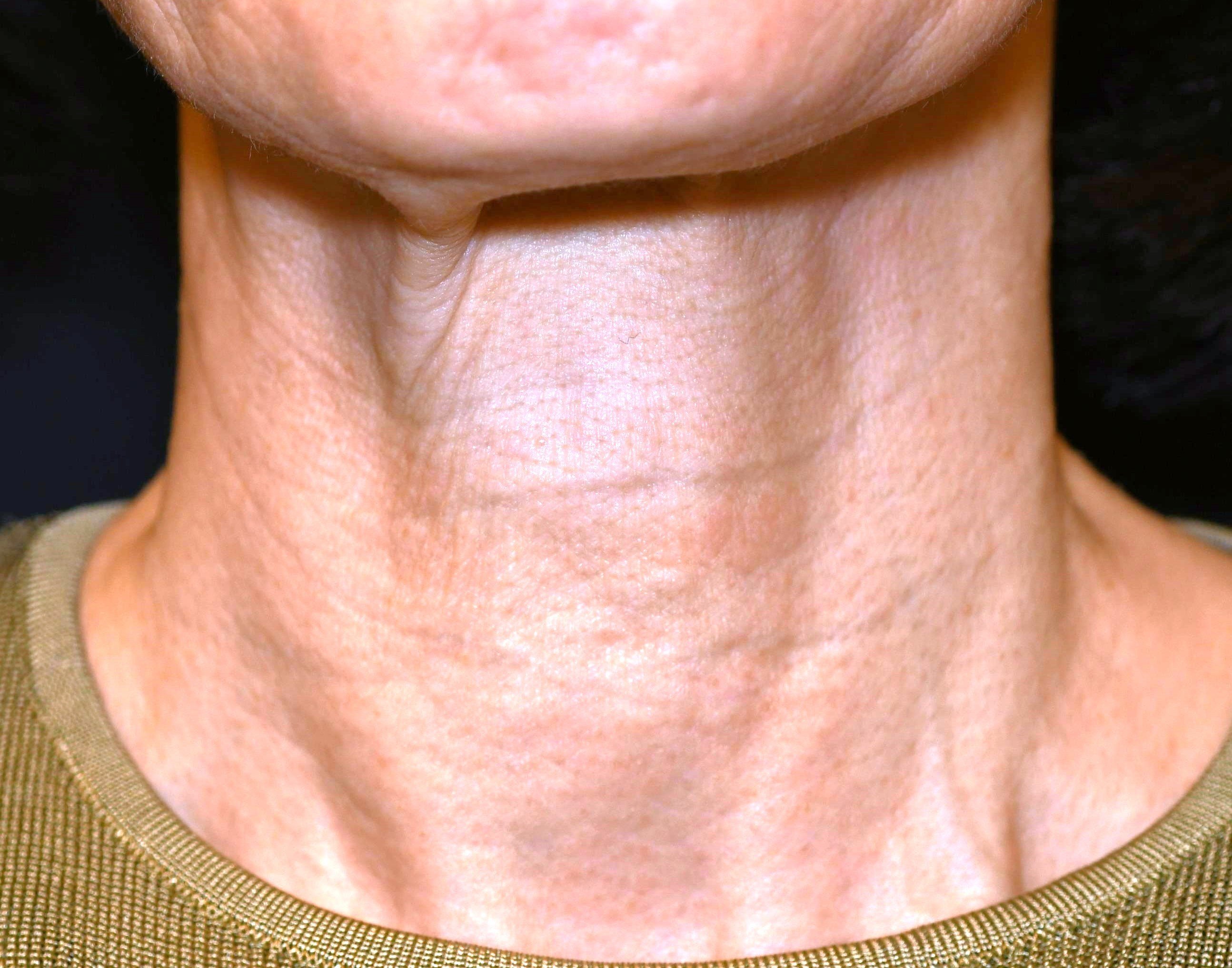 くっきり刻まれた首のシワや笑った時にはっきり出る口周りのカーテンじわは、かなり治療が難しい部位です。70歳のお誕生日を迎えた患者様ですが、サーマクールやウルセラリフトでのたるみ改善に加え、コラーゲンを増やすテクニックでヒアルロン酸注入を顔全体のバランスを整えながら行い、若返り効果にご満足いただいていました。最後に気になる首と口周りのシワに、ペプチド含有ヒアルロン酸製材のCGスタイラーを注入した2か月後の経過です。かなりシワが浅くなり、皮膚の質感も改善し、大変喜んでいただきました。