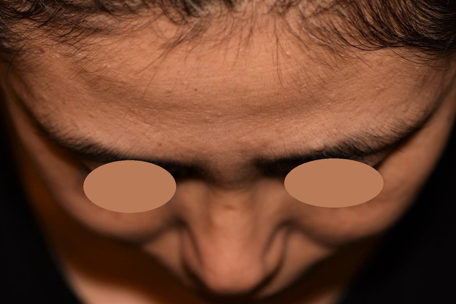 額は加齢に伴い皮膚のボリュームが減り、骨や脂肪が委縮すると、前頭骨のフォルムがそのまま表面に現れゴツゴツした状態になっていきます。症例の女性も額の凸凹が目立っていました。ボリュームの減少にはヒアルロン酸注入治療がおすすめです。注入後は眉上の深い凹み消え、額生え際~眉上にかけて自然な丸みが出ました。