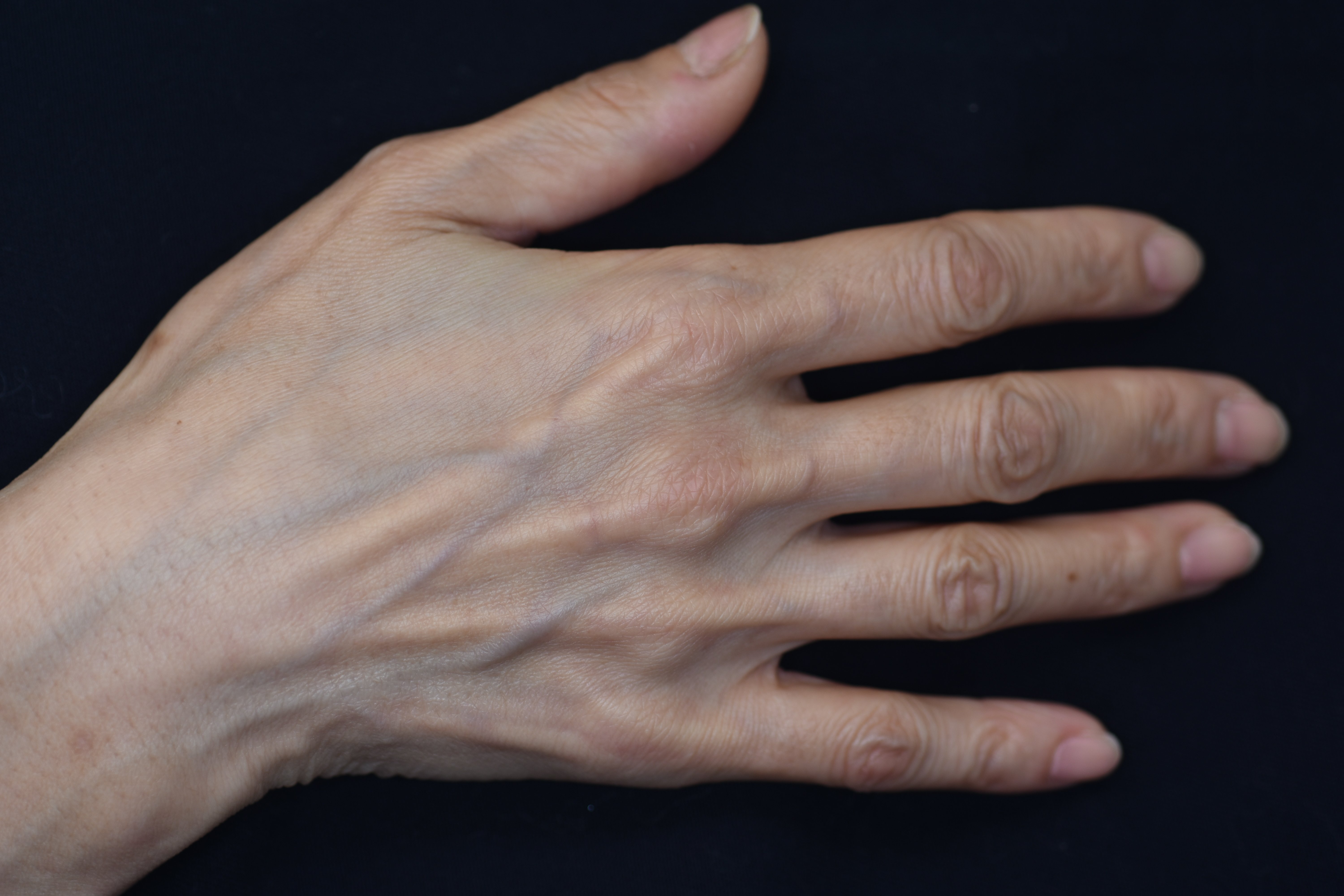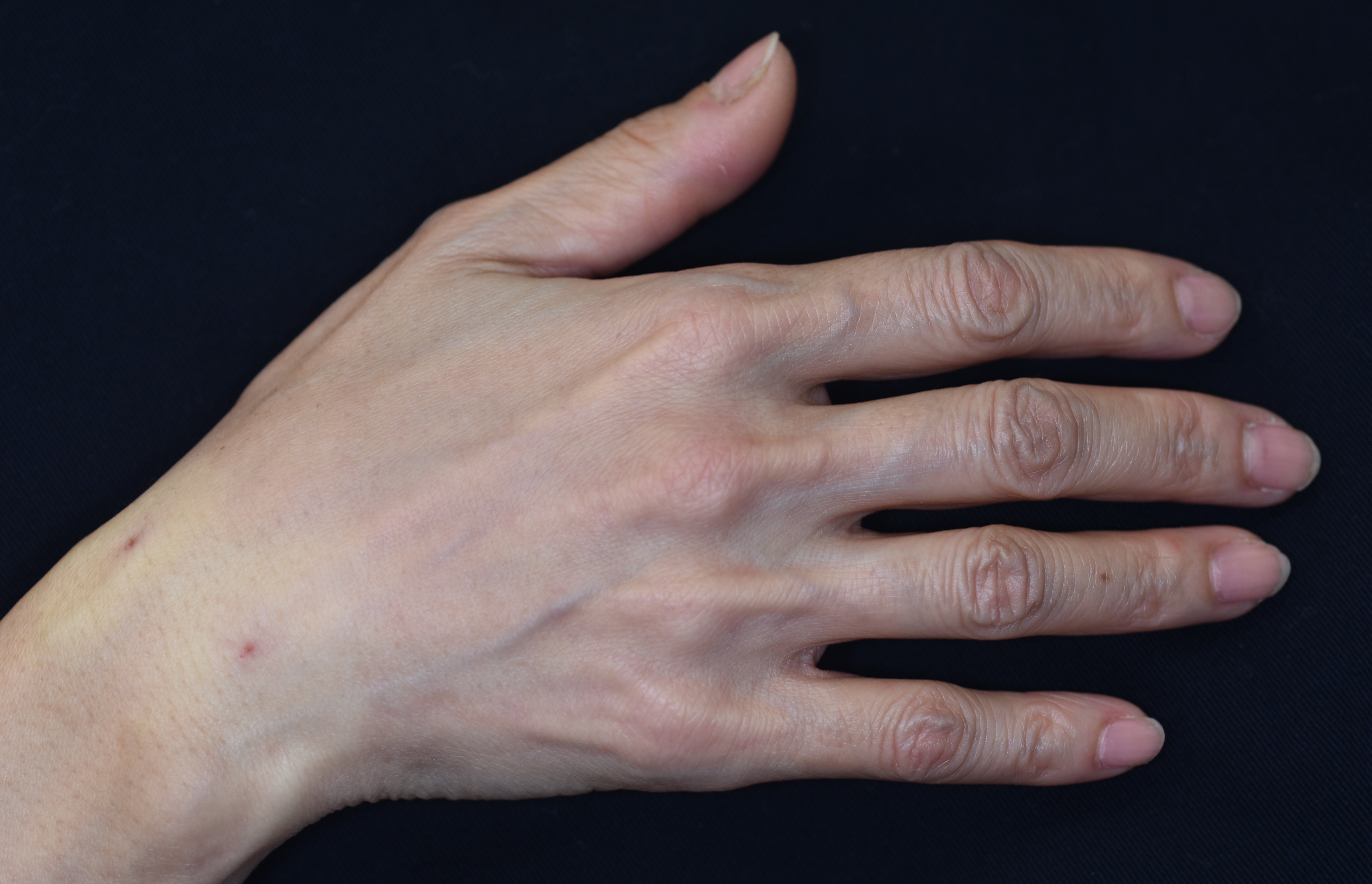 加齢変化は手にも出ます。筋張って静脈が浮き出た手の甲にヒアルロン酸を注入し、ふっくら若々しくなりました。加齢で筋張った手をふっくらさせるには、ボリュームロスの程度に応じた適正な注入量が必要です。目安としては、脂肪の減少が少ない方で片側1.0ml、中程度の方で、片側1.5ml、老化の顕著な方では片側2.0~3.0ml必要な場合が多いです。