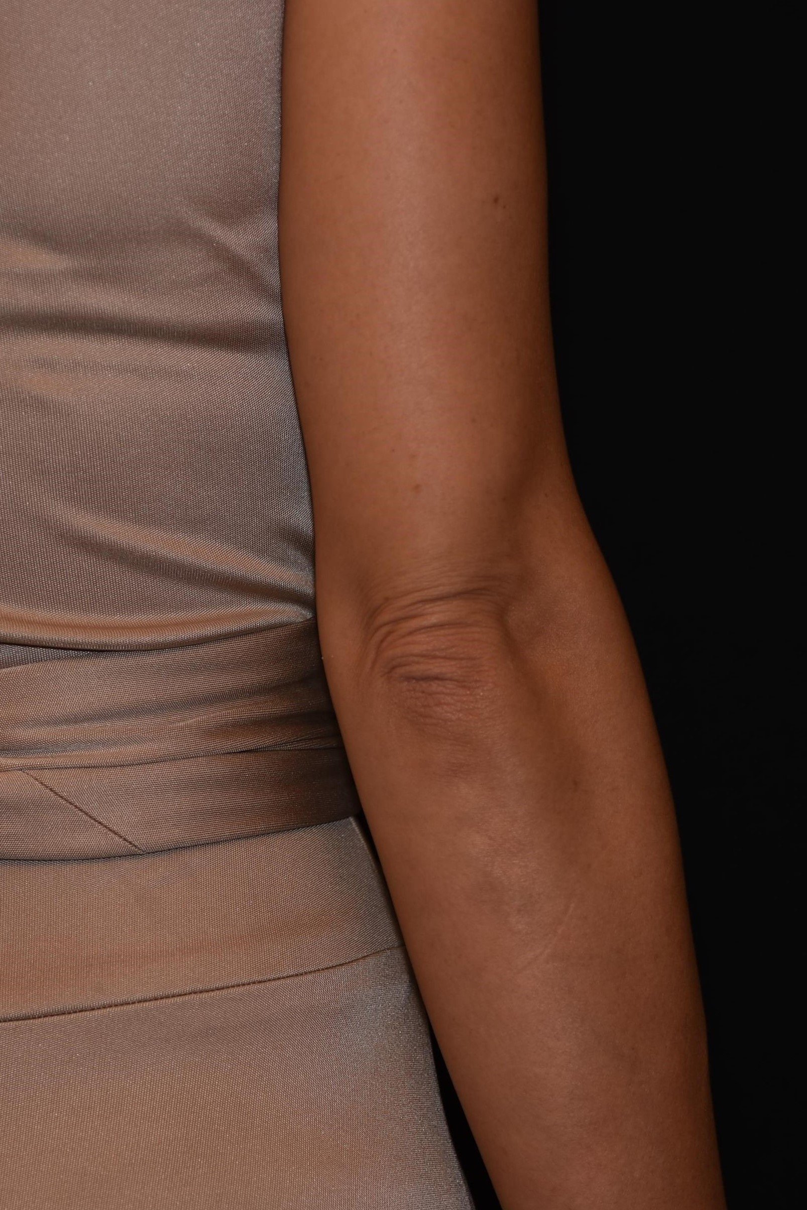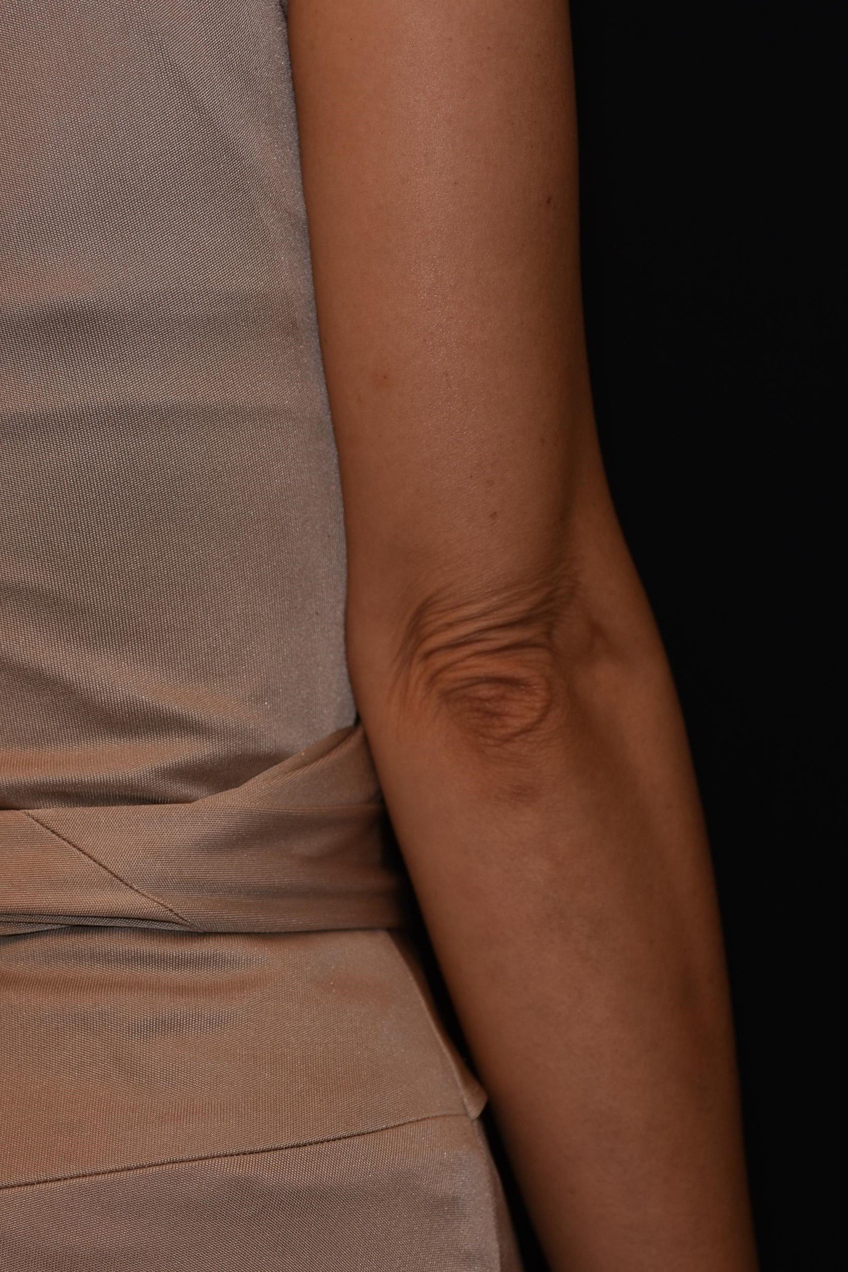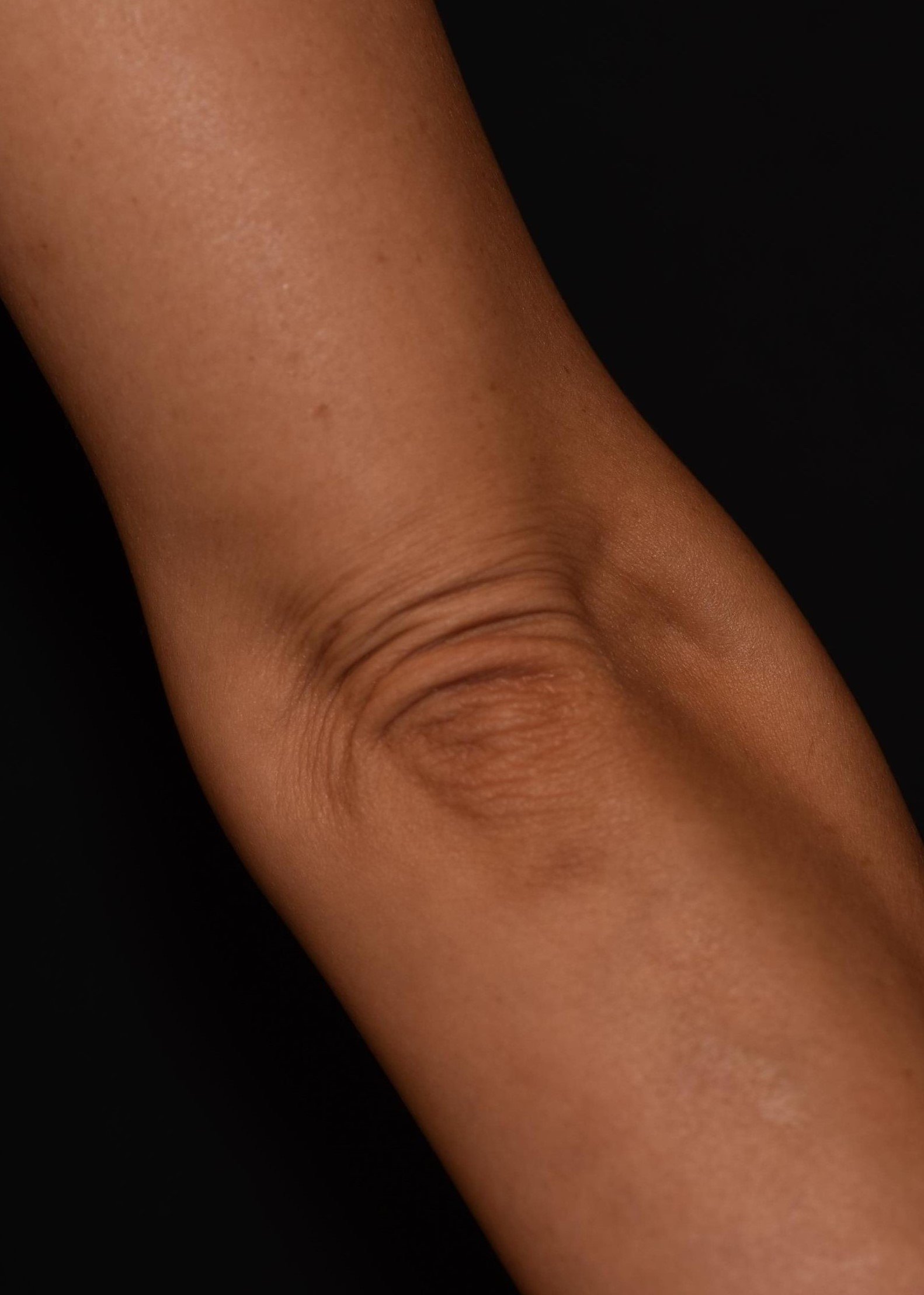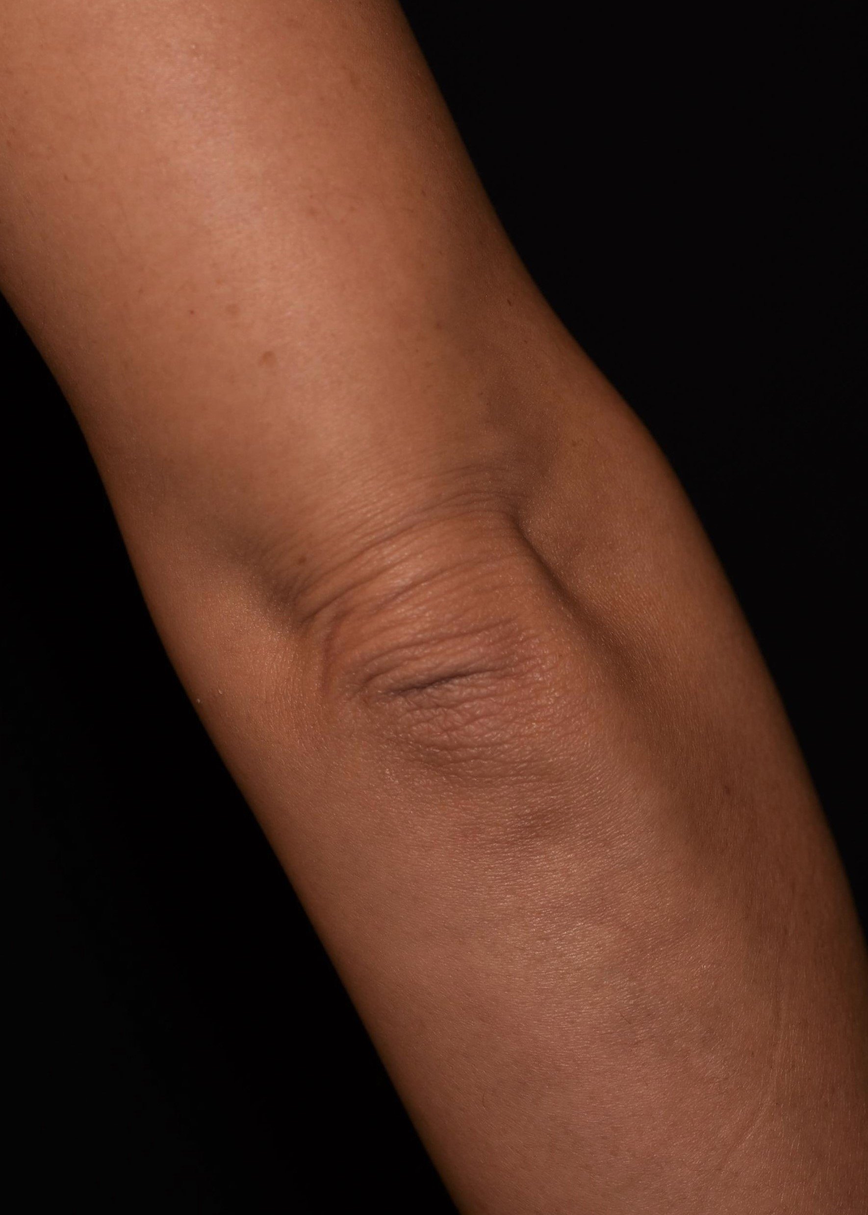 加齢によりひじのシワと萎み、黒ずみが目立つようになり、後ろ姿を気にされていました。注入後は、クルミ状に幾重にも重なっていたシワが目立たなくなりました。また、ヒアルロン酸の美肌効果で肌が潤い、ひじのくすみも目立たなくなりました。 注入直後はボリュームが出て、少しの凸凹した感じになりますが、2週間程で馴染みます。自然な仕上がりにとてもご満足いただきました。ヒアルロン酸を注入すると、自己のコラーゲン線維やヒアルロン酸などが新生するため、老化のスピードを緩やかになります。