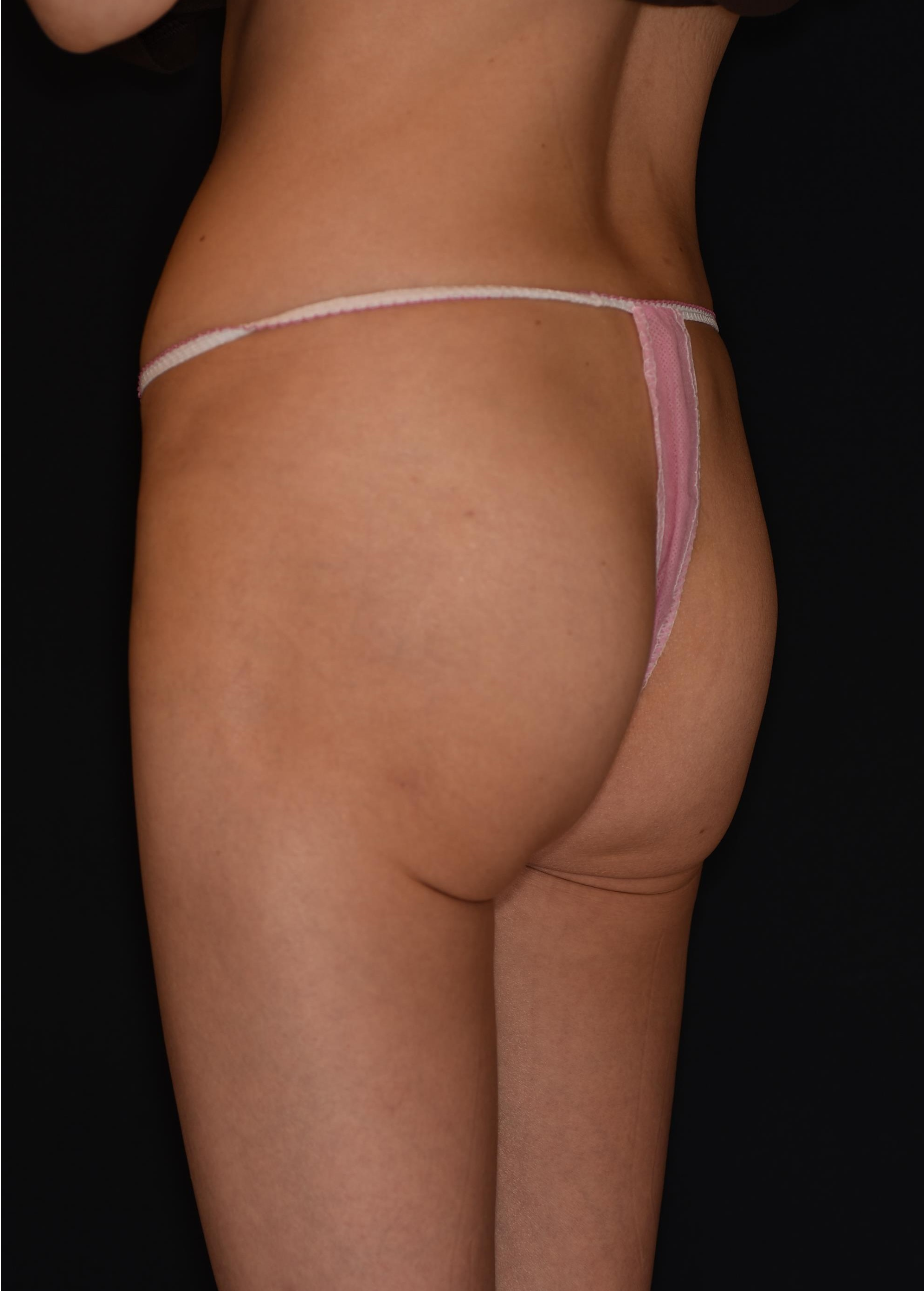 お尻全体のたるみにより生じた側面の削げ(凹み)にお悩みでした。お尻の注入に使用するヒアルロン酸製剤は、顔の製剤と比較して粒子のサイズが大きく、ヒアルロン酸の吸収速度が遅いため、持続期間が1~2年と長くなります。 症例の女性は、2回に分けて注入しました。1回目はお尻の側面、2回目は高さを出すため、お尻の中央上方にボリュームを足しました。注入後は、お尻側面の削げがなくなり、自然な丸みのあるヒップラインに整いました。また、中央にボリュームを足したことで、お尻のトップの位置が上がっています。ヒアルロン酸製剤を注入すると、自己のコラーゲン線維やヒアルロン酸などが新生するため、老化予防にもなります。