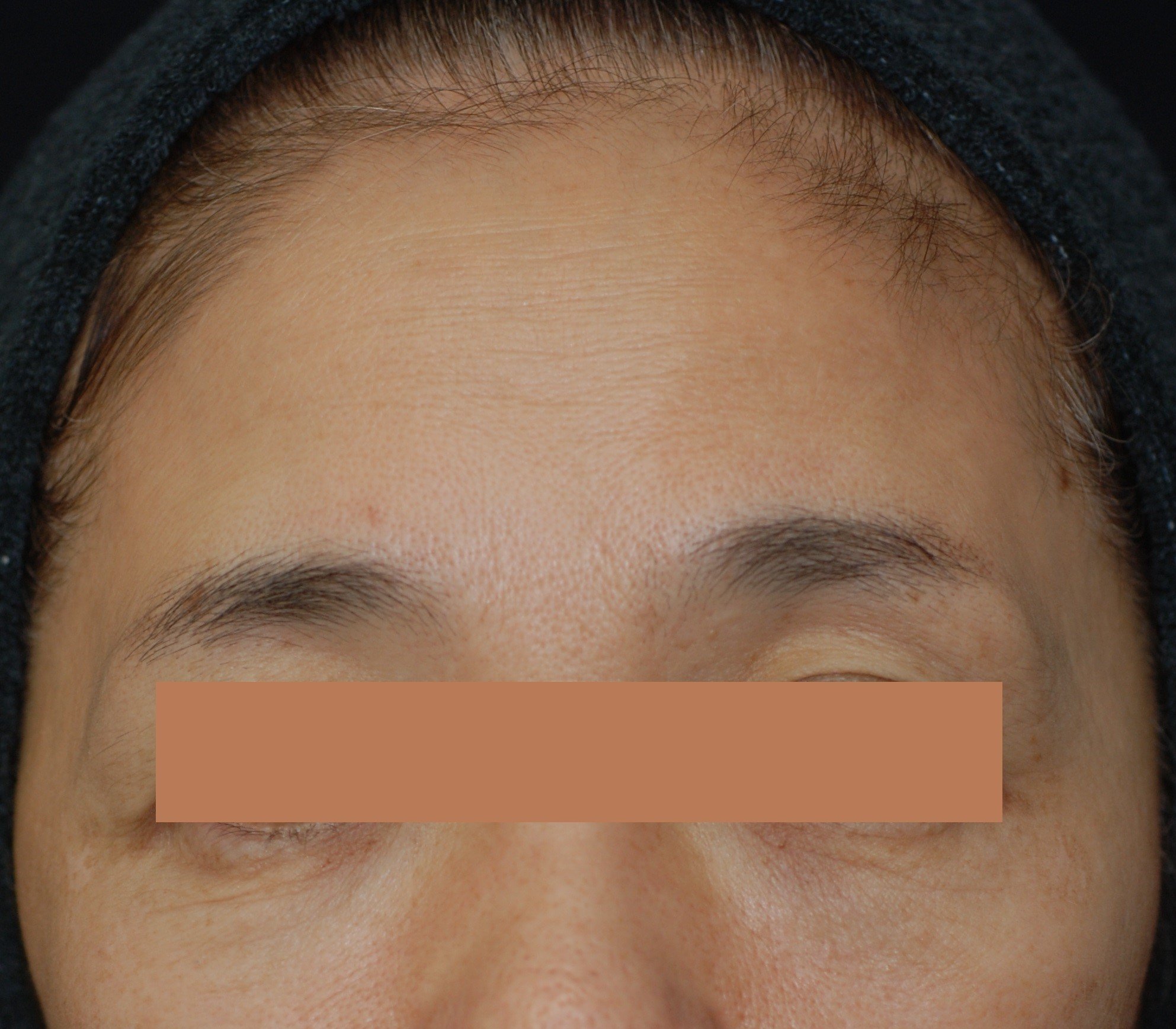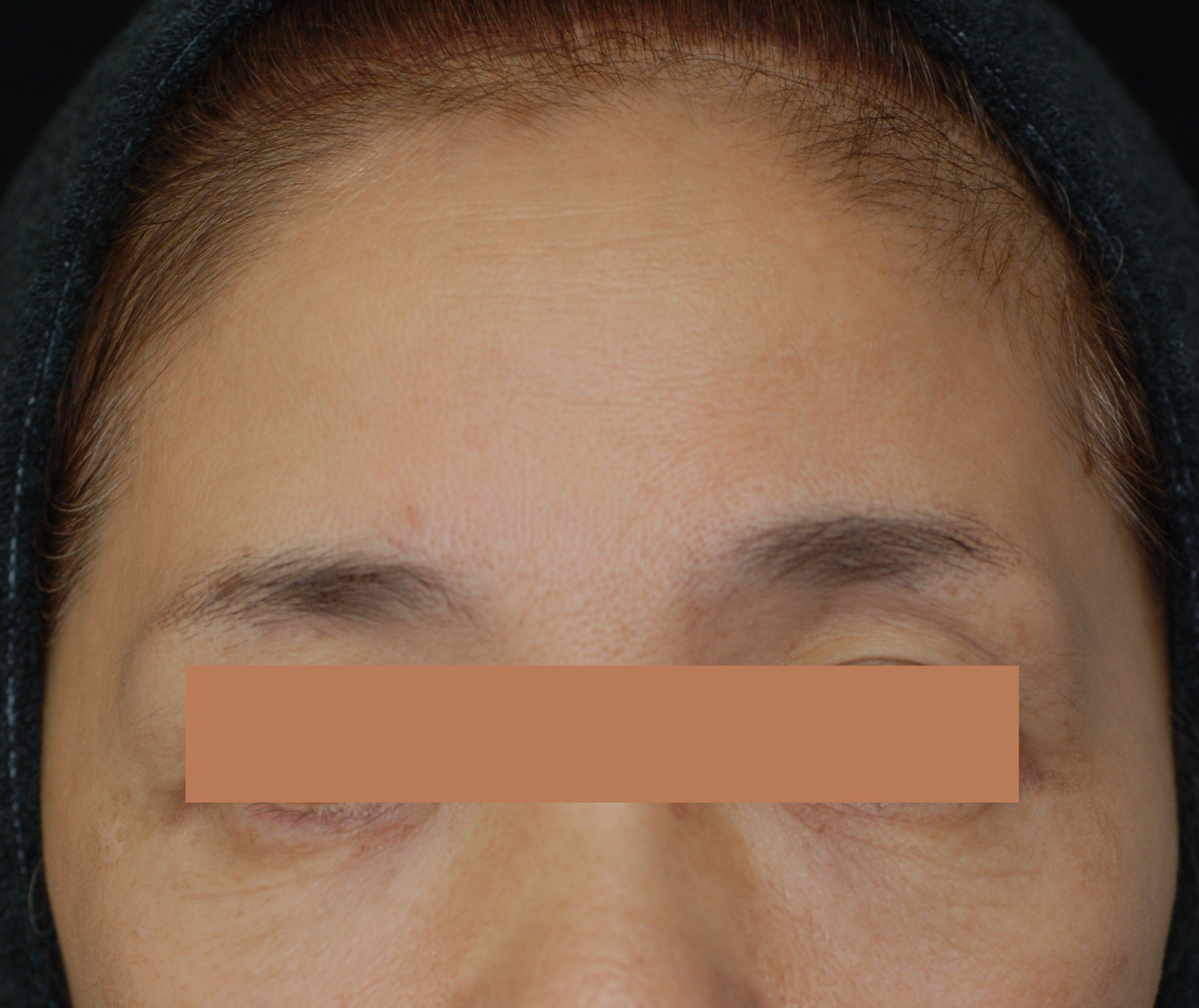 写真ではわかりづらいですが、繰り返す表情による折りぐせが額と目尻に定着しつつありました。筋肉の収縮によってできた表情ジワには、筋弛緩作用のあるボトックス注射が即効性を発揮します。ただし、額と目尻は表情を大きく左右する場所なので、顔立ちや年齢、眼瞼下垂の程度を見極め、適切な部位に適切な量のボトックスを注射する必要があります。 症例の女性には、筋肉の動きを大きく止めすぎることなく、筋肉の表面繊維だけの働きを弱めることによって、自然な表情を保ちシワを改善する「メソボトックス(マイクロボトックス)」を行いました。自然な表情を保ちながら、シワを改善し、肌を引き締めます。眼瞼下垂がある年代でも安心して受けていただけます。