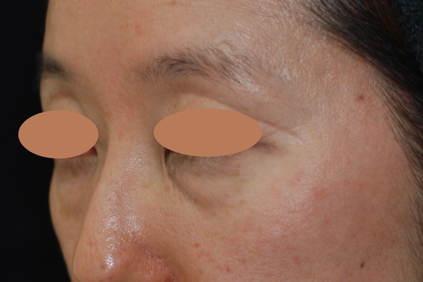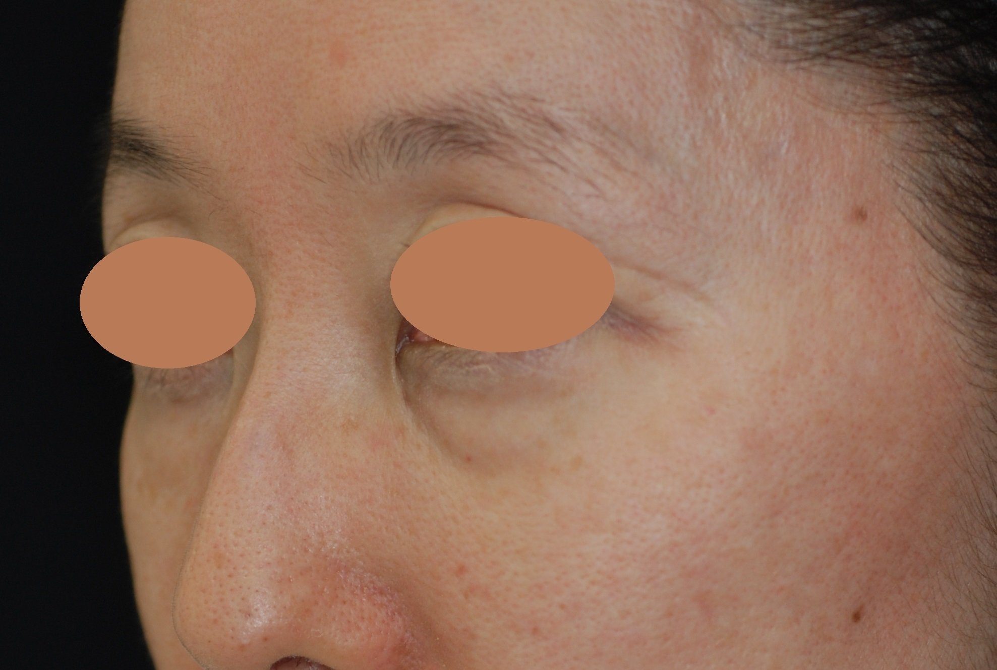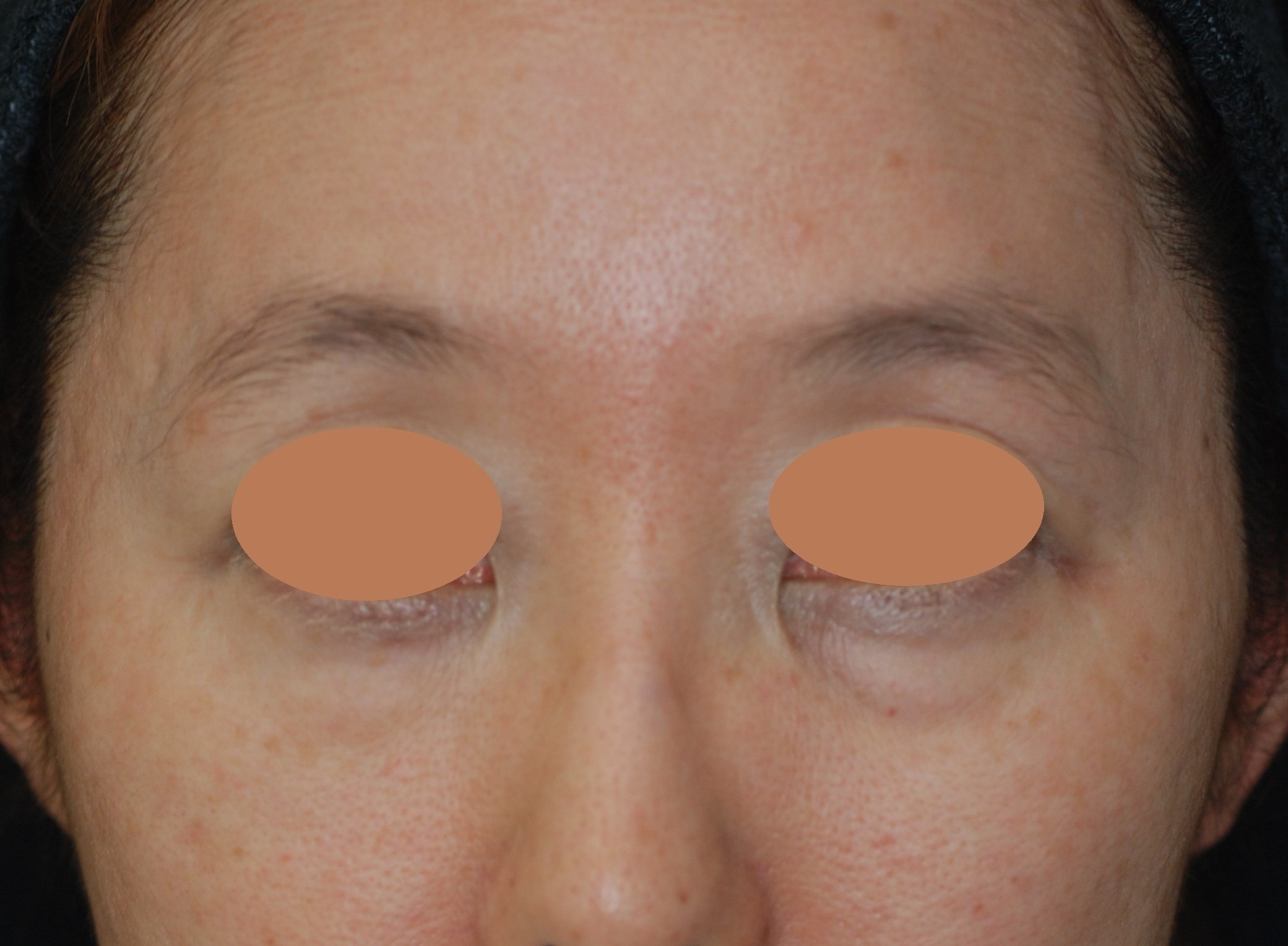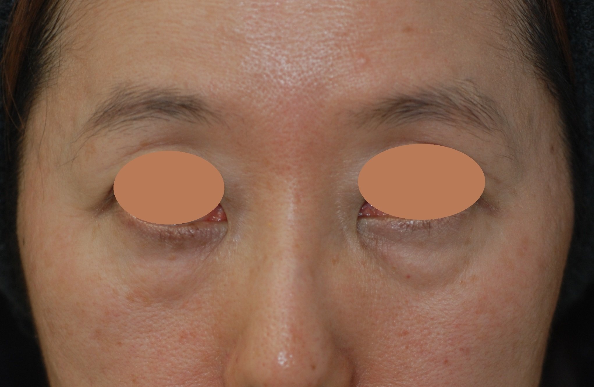 加齢とともに目立つ目の下の膨らみは、顔面靭帯・眼輪筋・筋膜・皮膚が伸びてたるみ、支えきれなくなった眼窩内脂肪が突出することで出現するヘルニアの様な症状です。1回の照射で伸びた靭帯や皮膚が強力に引き締まり、目元の疲れた印象が改善しました。