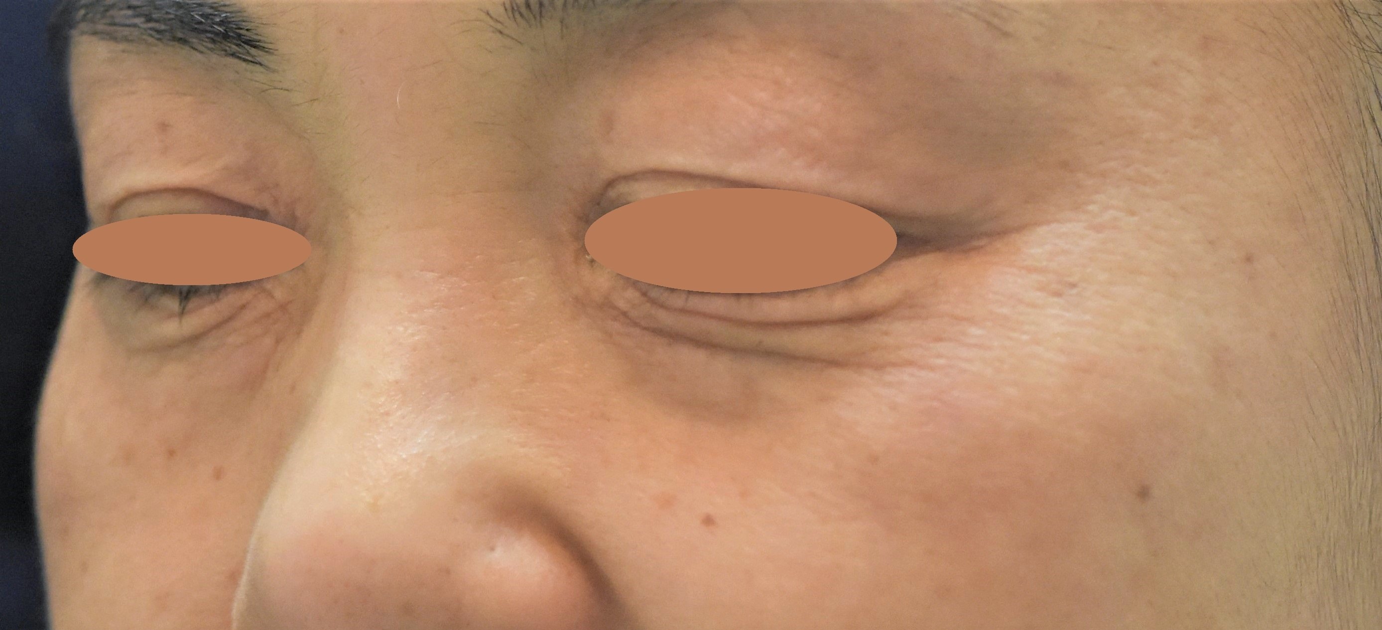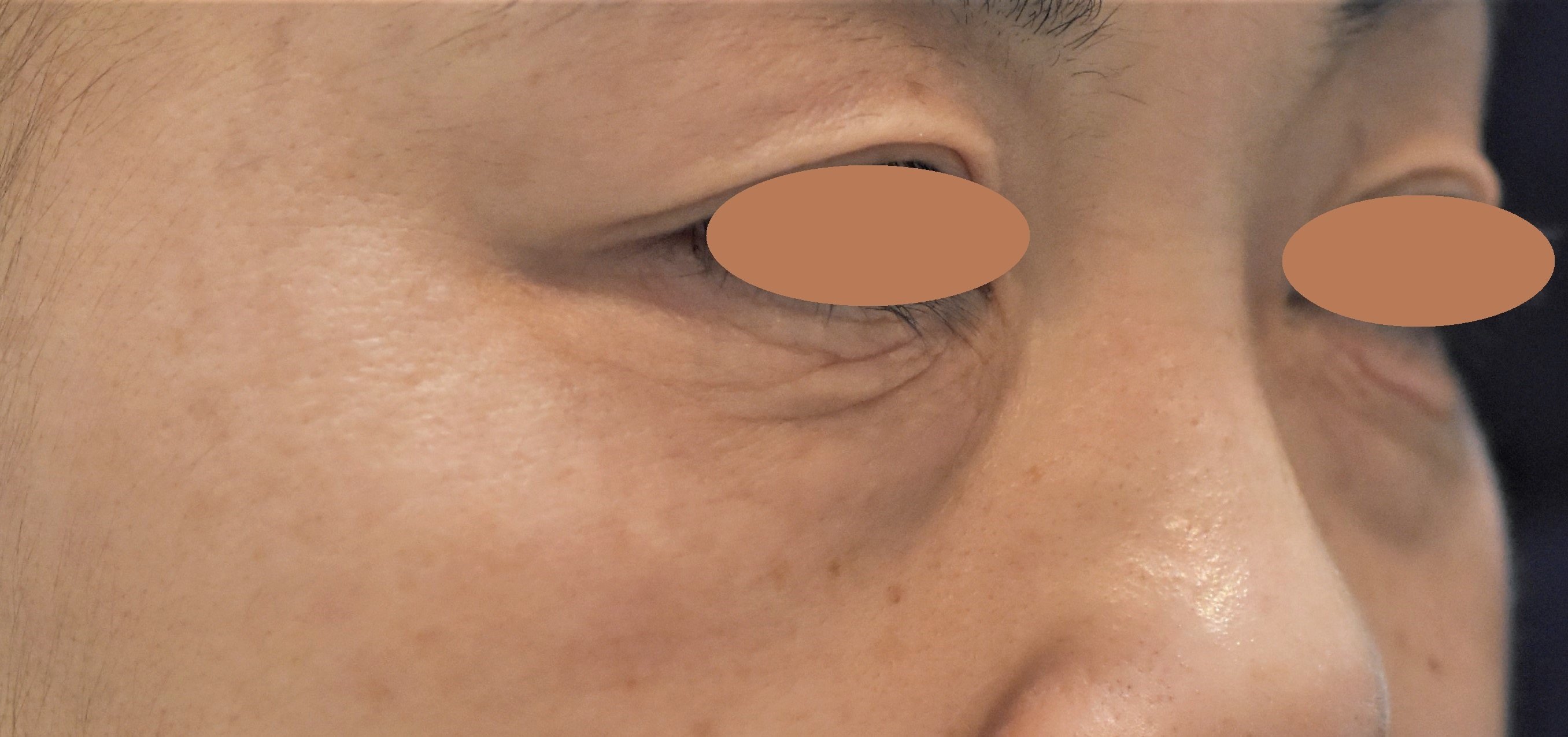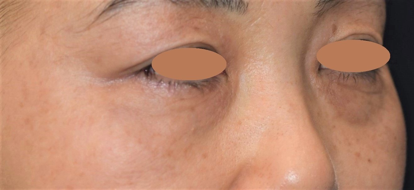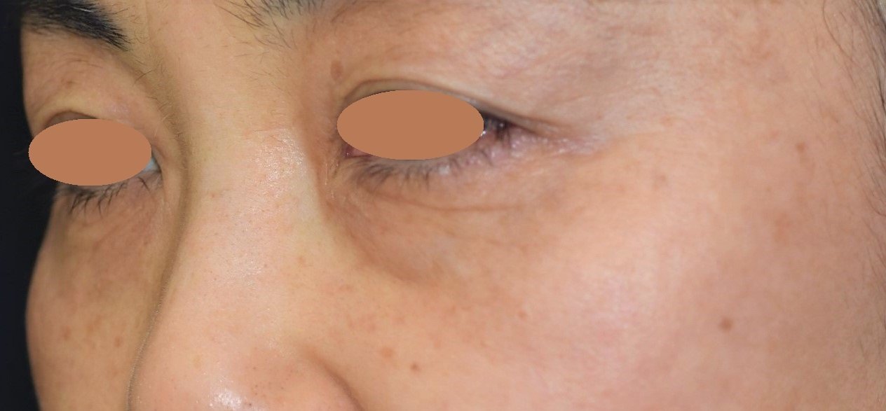 照射半年後の写真です。施術前に比べて、肌の弾力が回復して目の下のしぼみが改善され、シワやたるみがかなり目立たなくなりました。